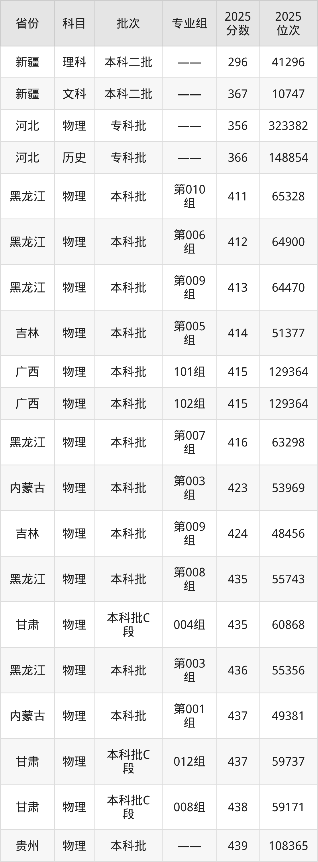 最低录取分数线是296分,对应位次是41296名,招生地区为新疆;