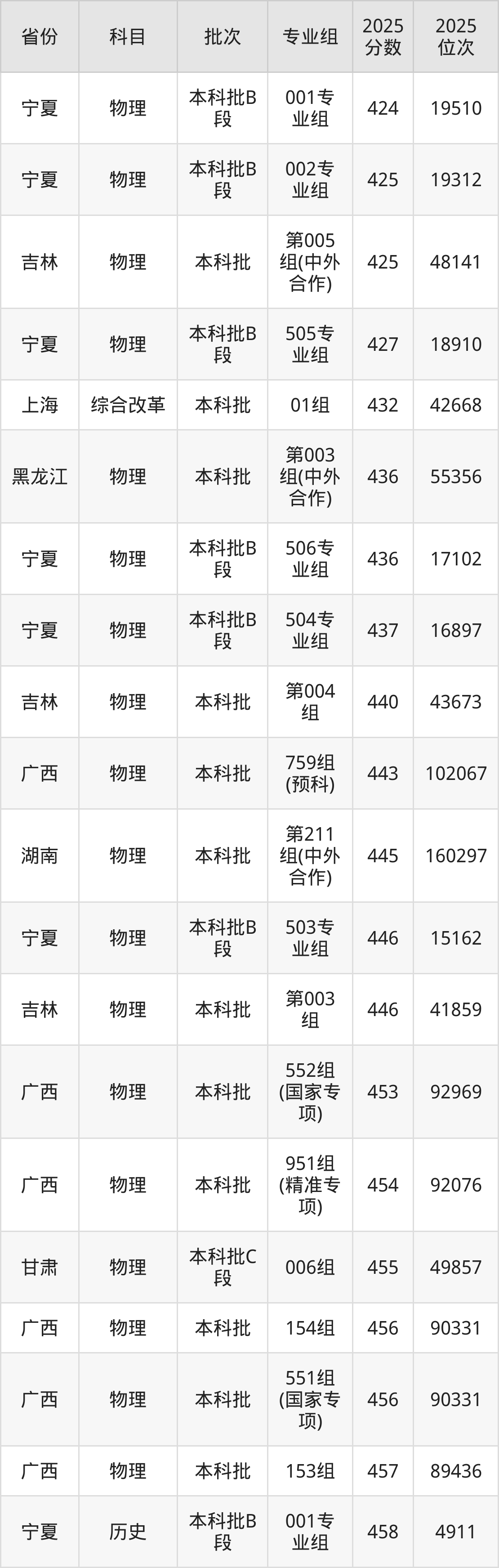 最低录取分数线是458分,对应位次是4911名,招生地区为宁夏;