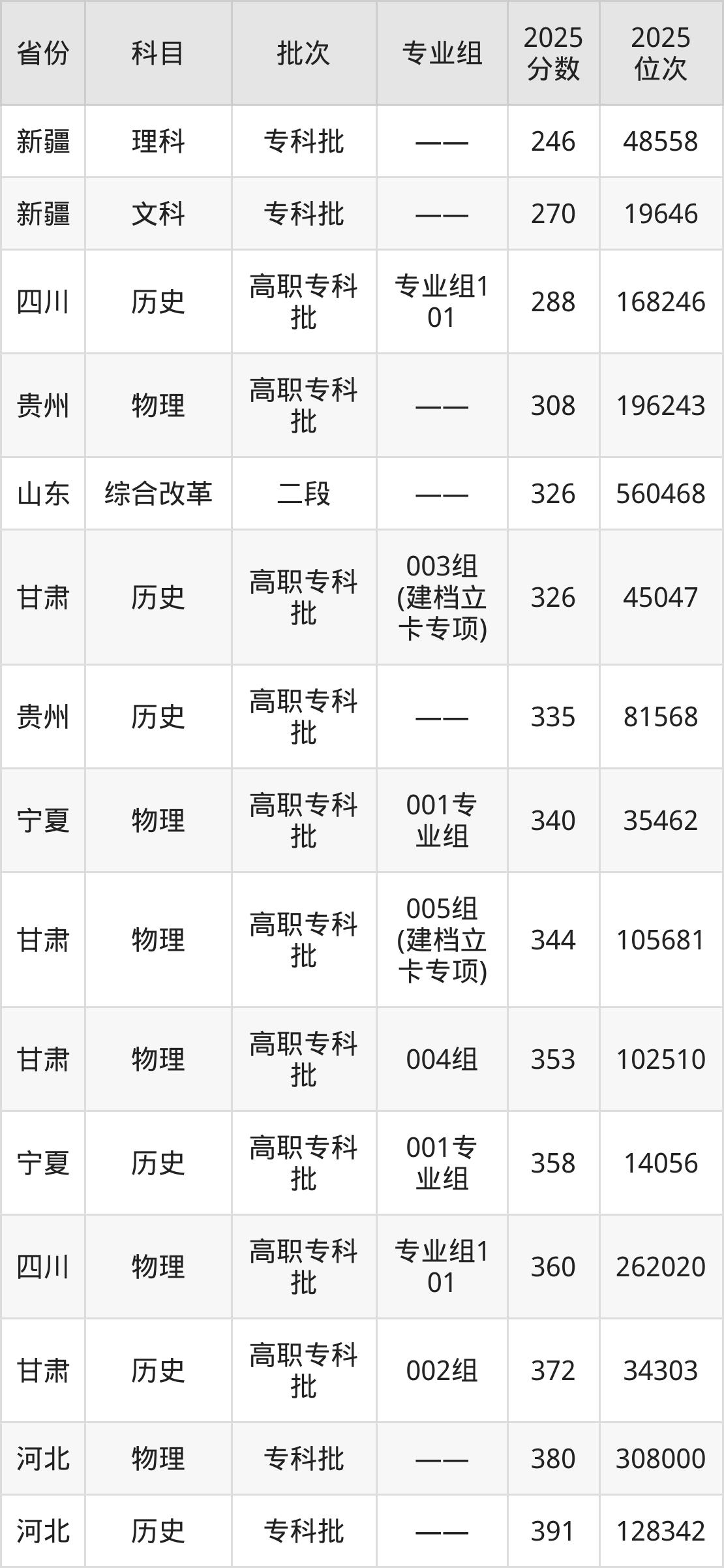 2025年兰州职业技术学院在各省物理类和理科的录取分数线位于246分-380分之间。