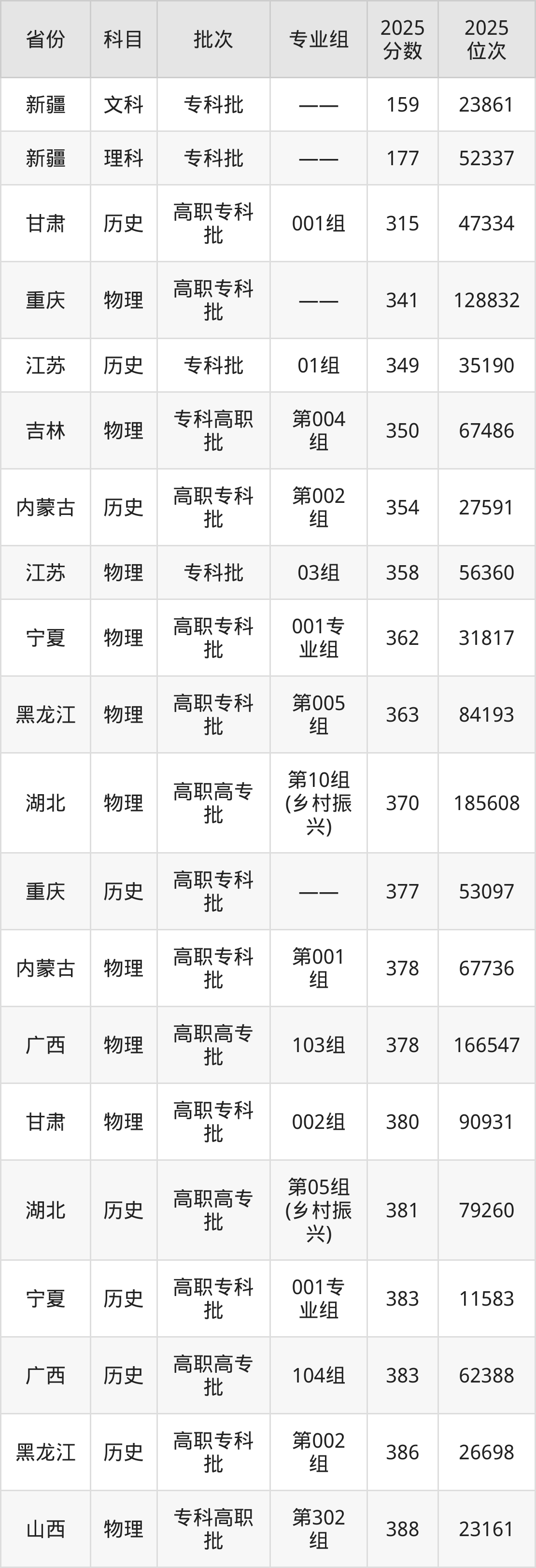 最低录取分数线是159分,对应位次是23861名,招生地区为新疆;