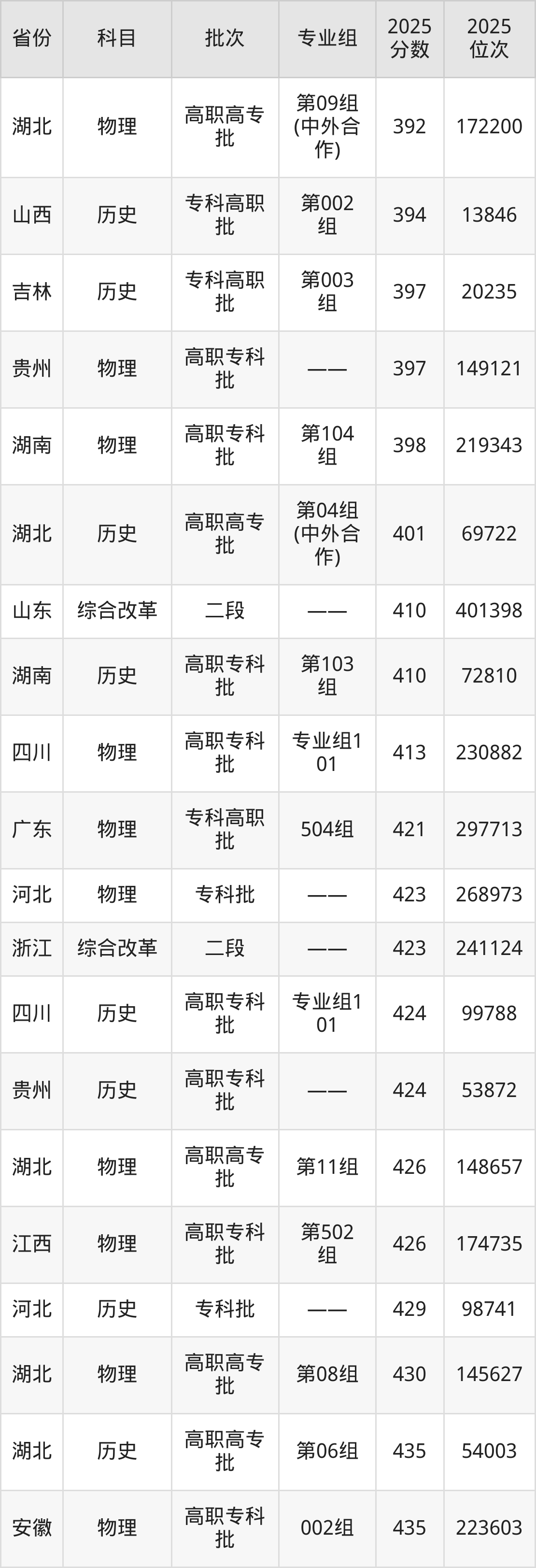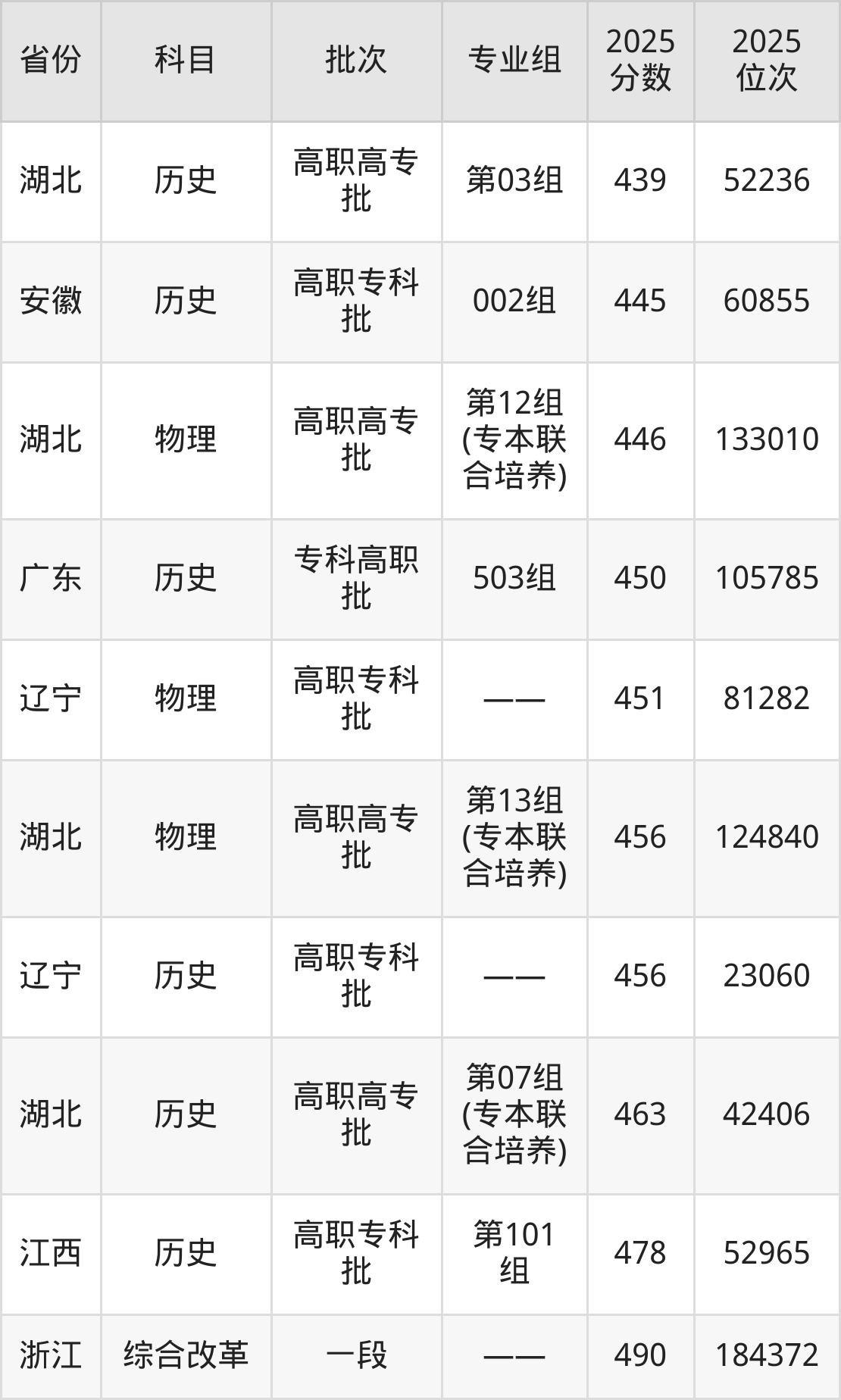 2025年武汉船舶职业技术学院在各省普通批录取分数线一览表: