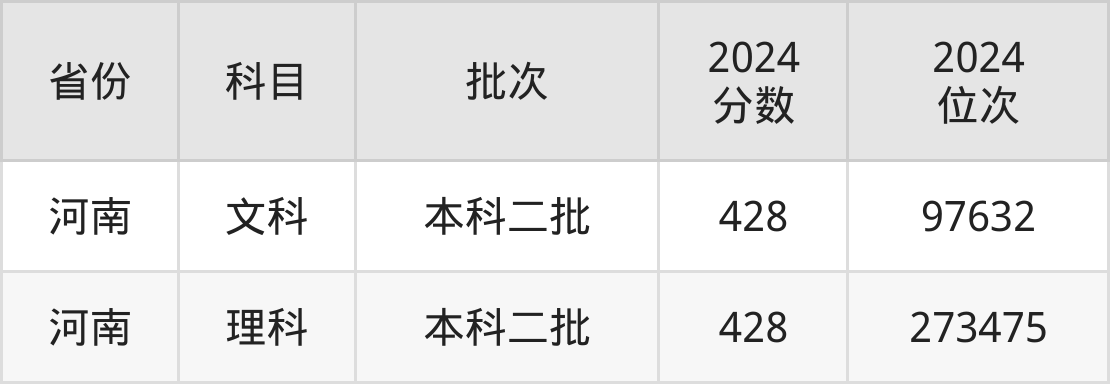 最低录取分数线是428分,对应位次是273475名,招生地区为河南。