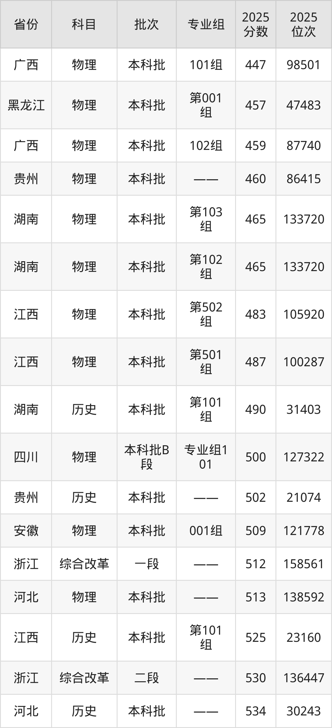 最低录取分数线是447分,对应位次是98501名,招生地区为广西;