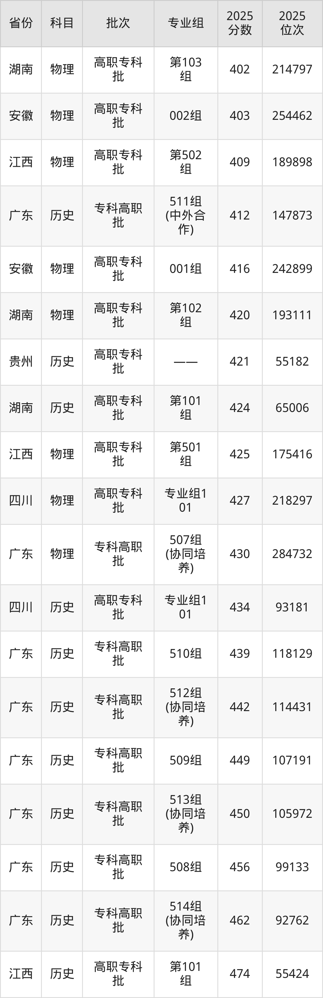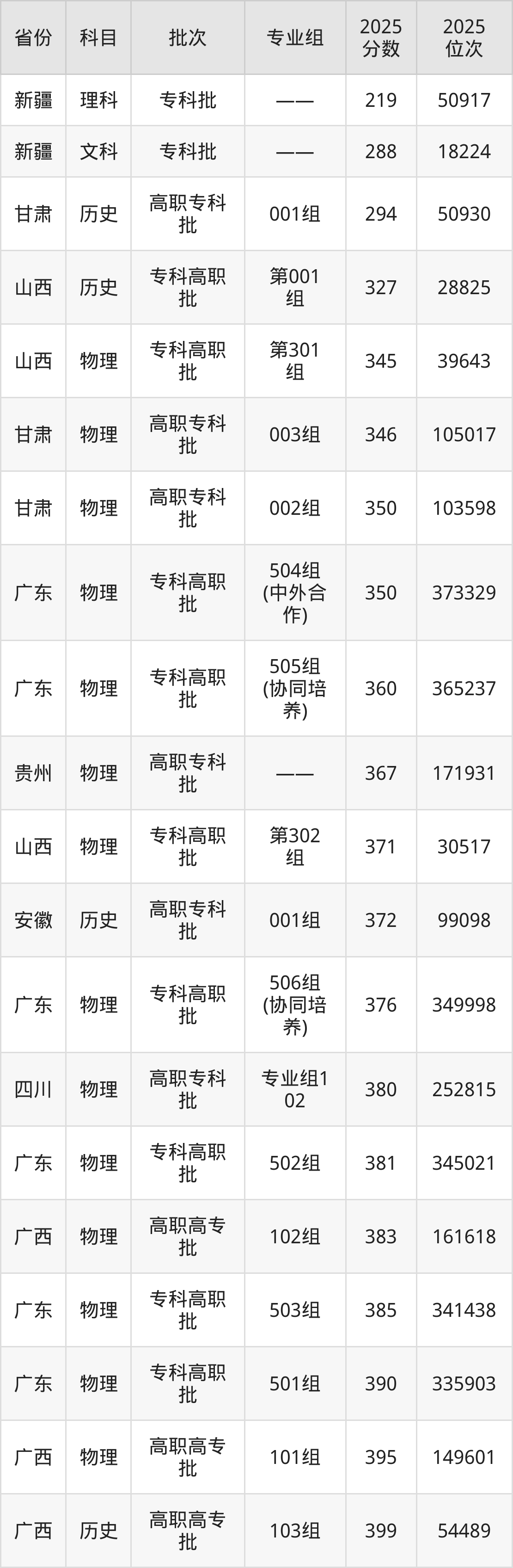 2025年广东建设职业技术学院在各省普通批录取分数线一览表: