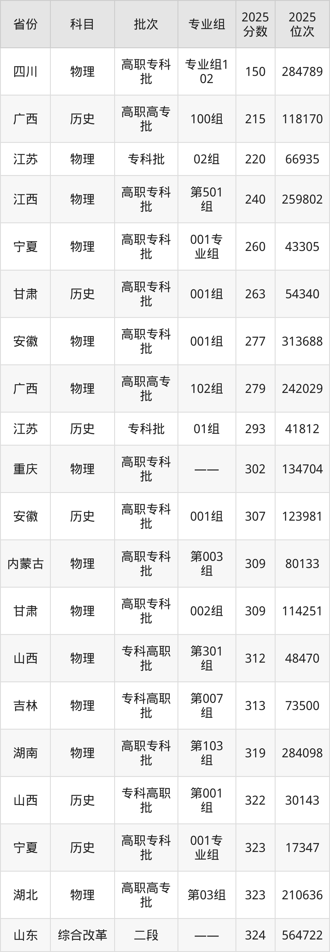 最低录取分数线是150分,对应位次是284789名,招生地区为四川;