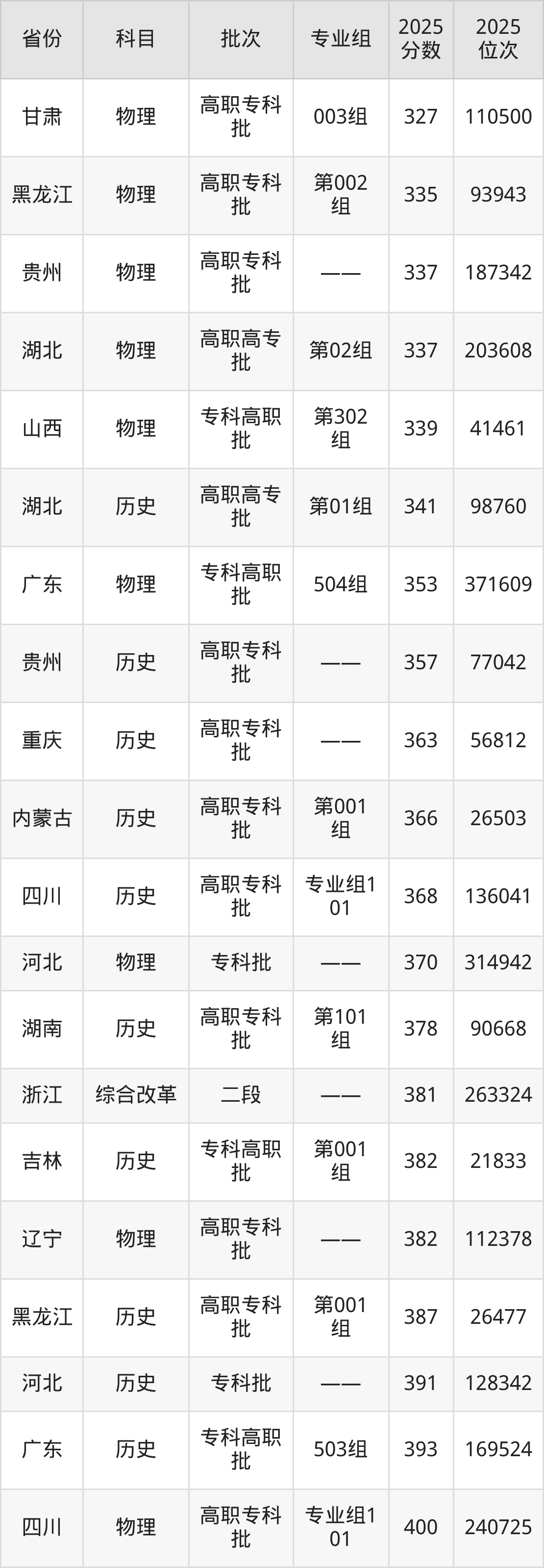 2025年唐山幼儿师范高等专科学校在各省普通批录取分数线一览表: