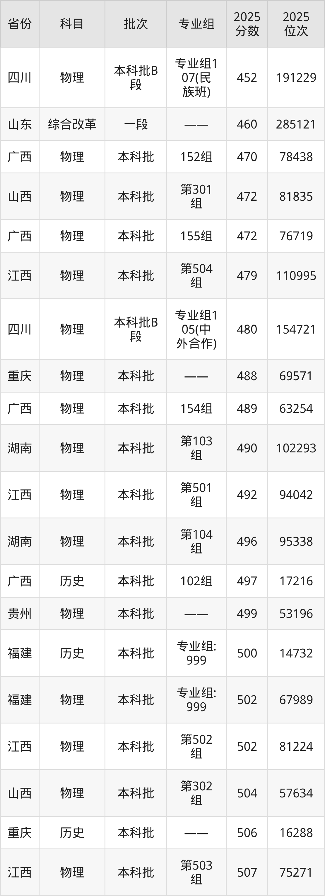 最低录取分数线是452分,对应位次是191229名,招生地区为四川;