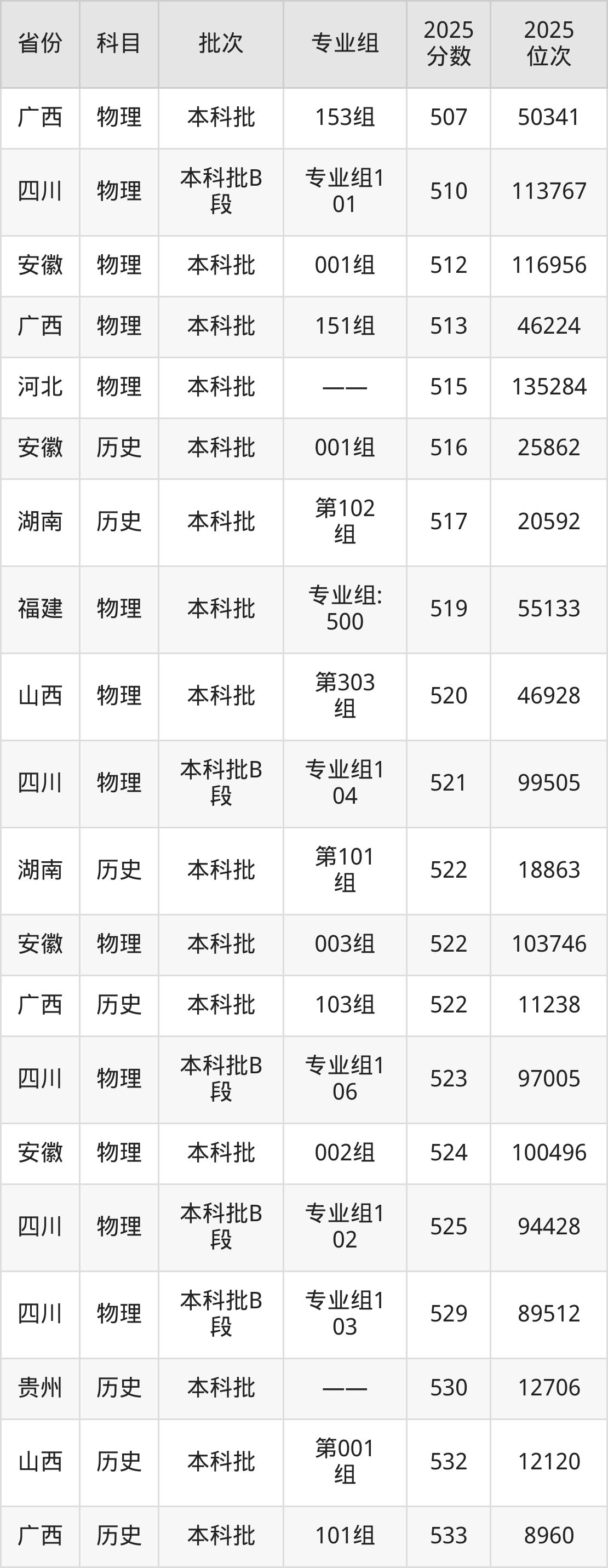 最低录取分数线是497分,对应位次是17216名,招生地区为广西;