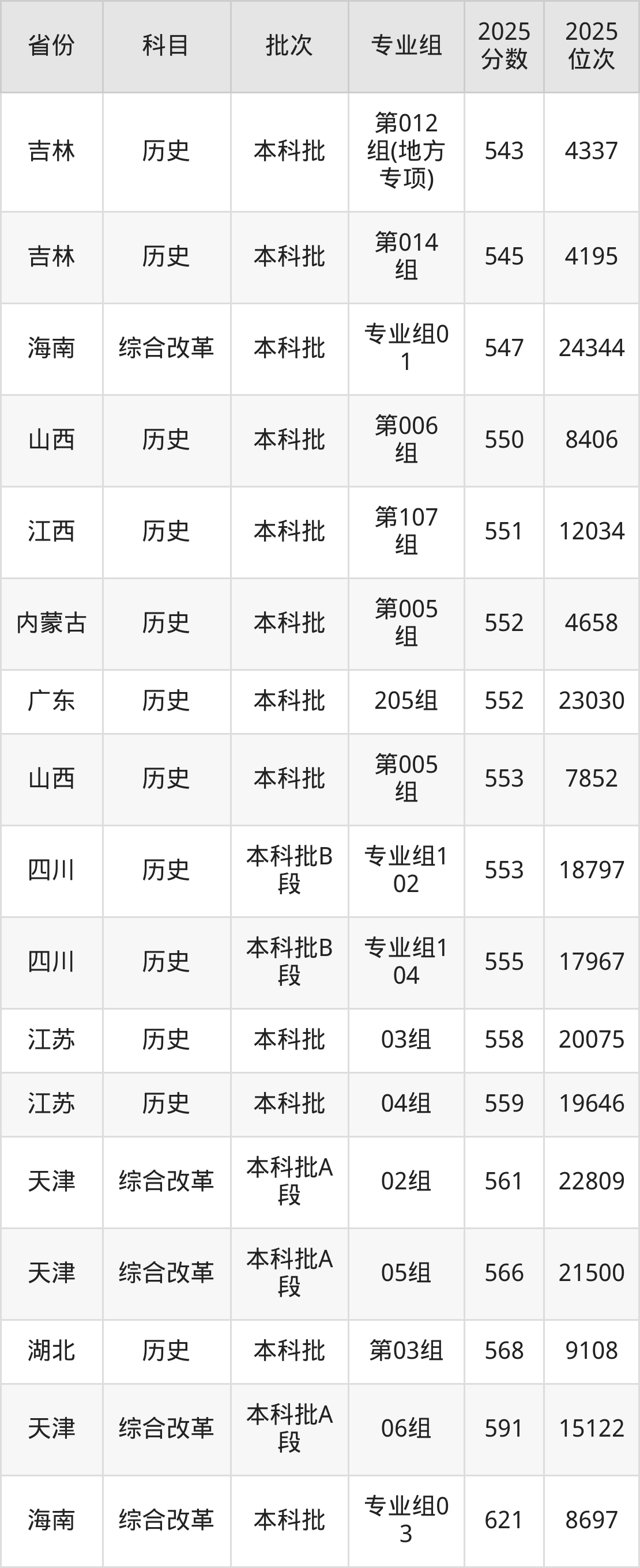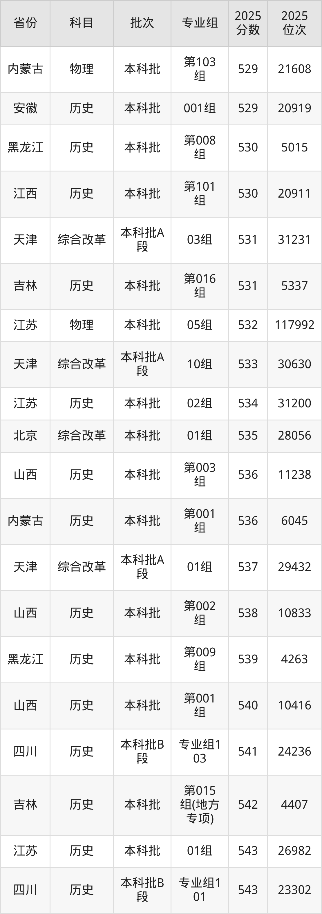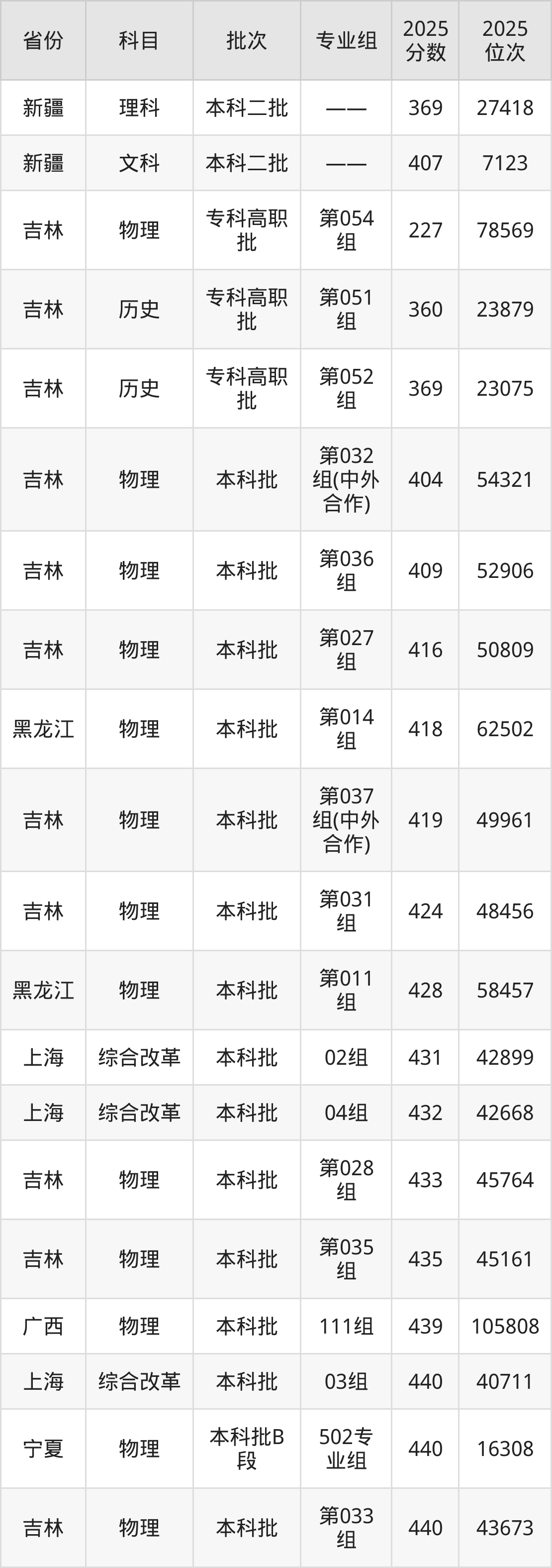 2025年吉林师范大学在各省普通批录取分数线一览表: