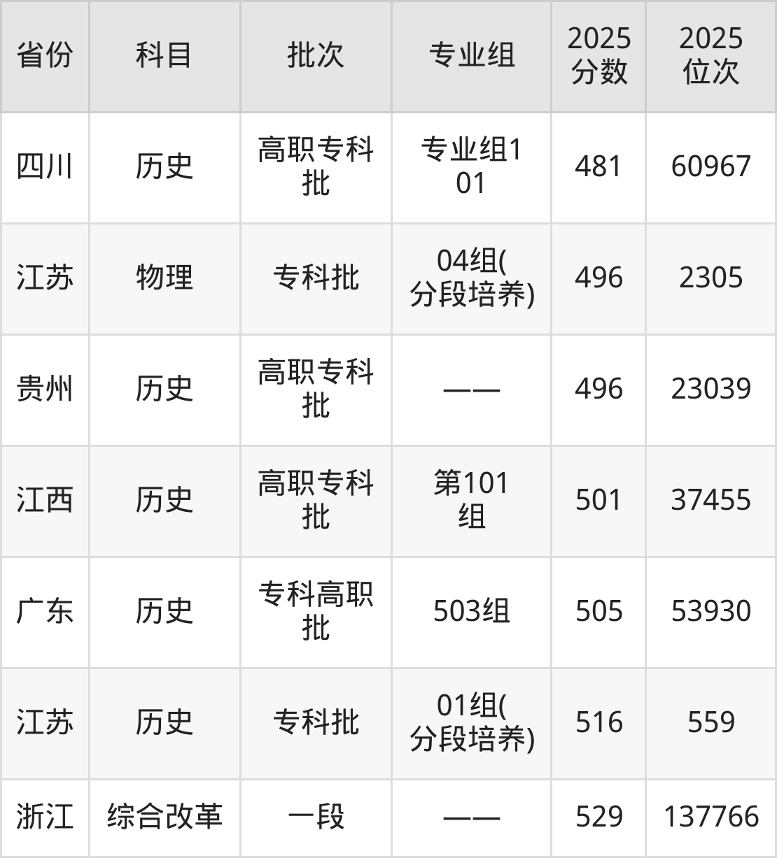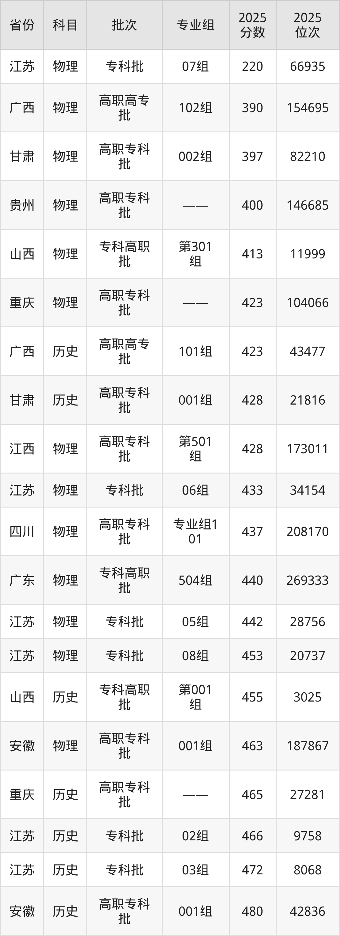 2025年苏州卫生职业技术学院在各省普通批录取分数线一览表: