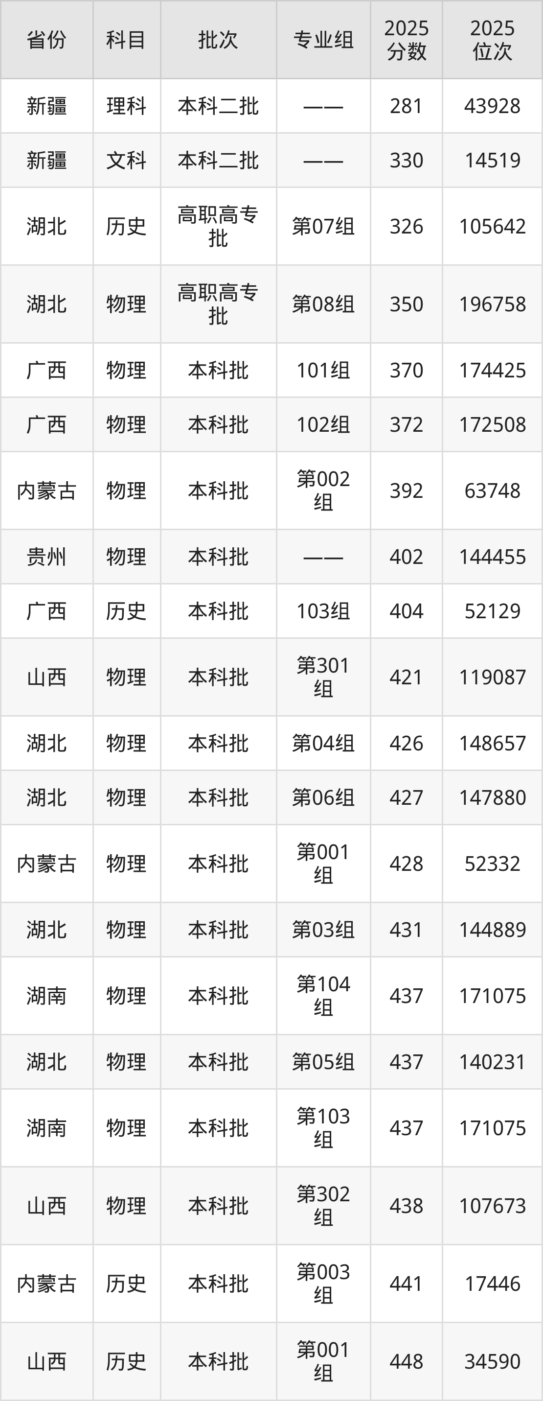 最低录取分数线是326分,对应位次是105642名,招生地区为湖北;