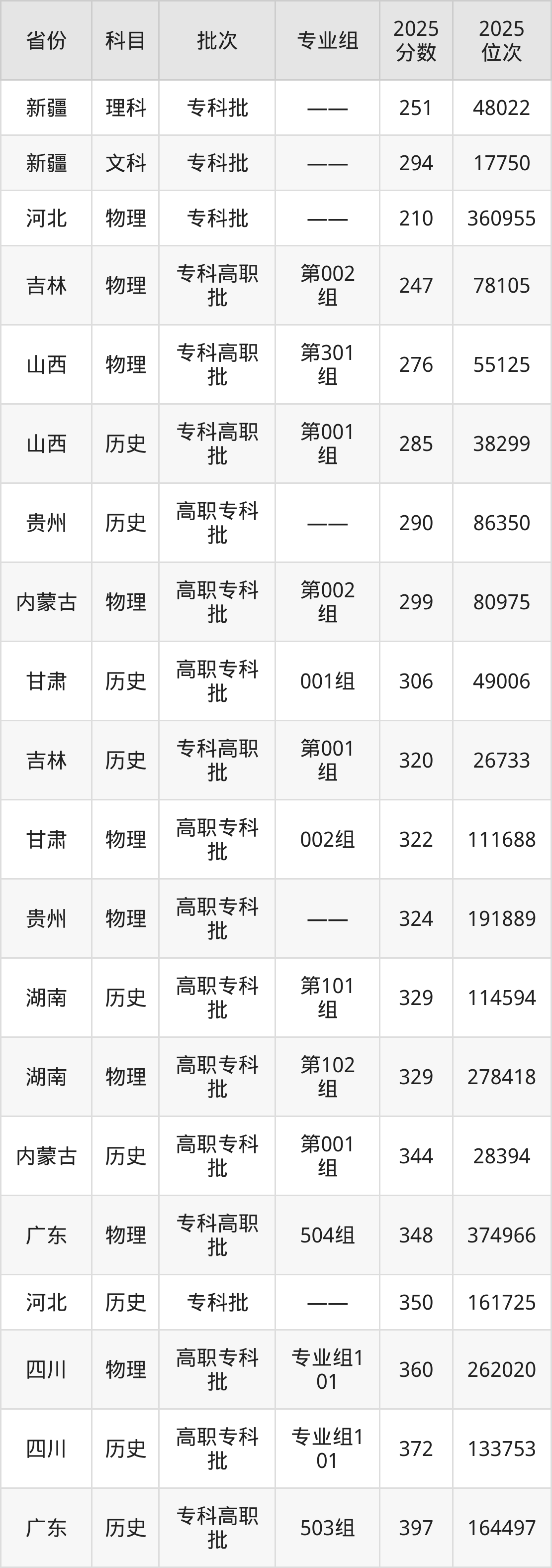 2025年张家口职业技术学院在各省普通批录取分数线一览表: