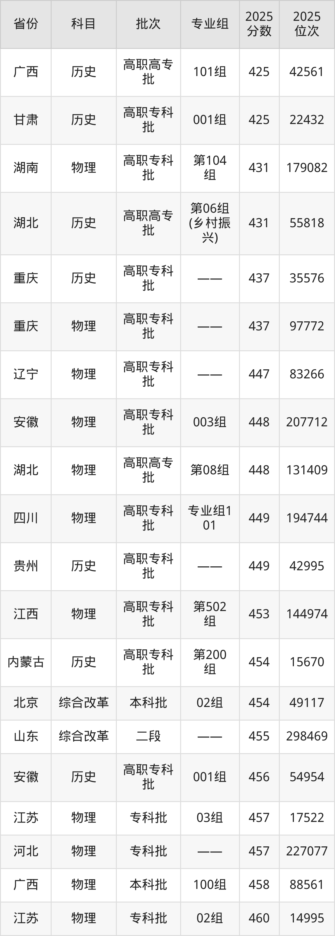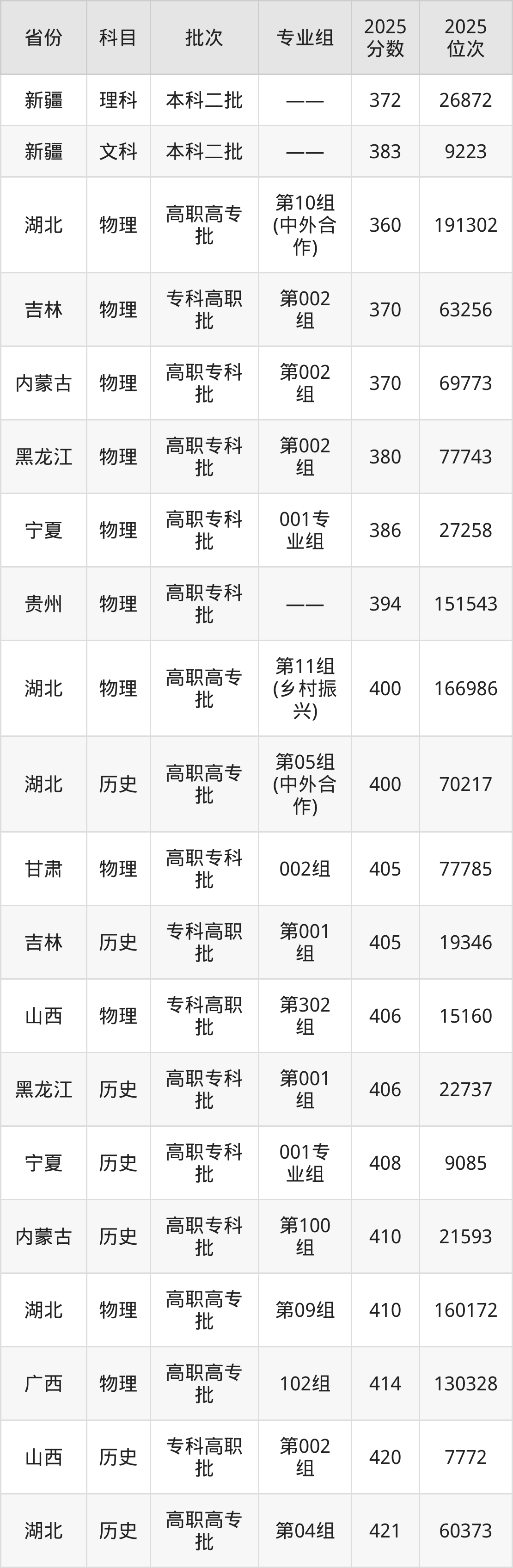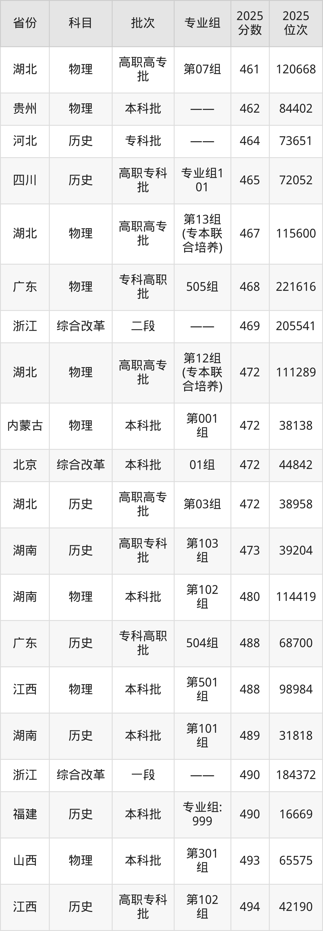 2025年武汉职业技术大学在各省普通批录取分数线一览表: