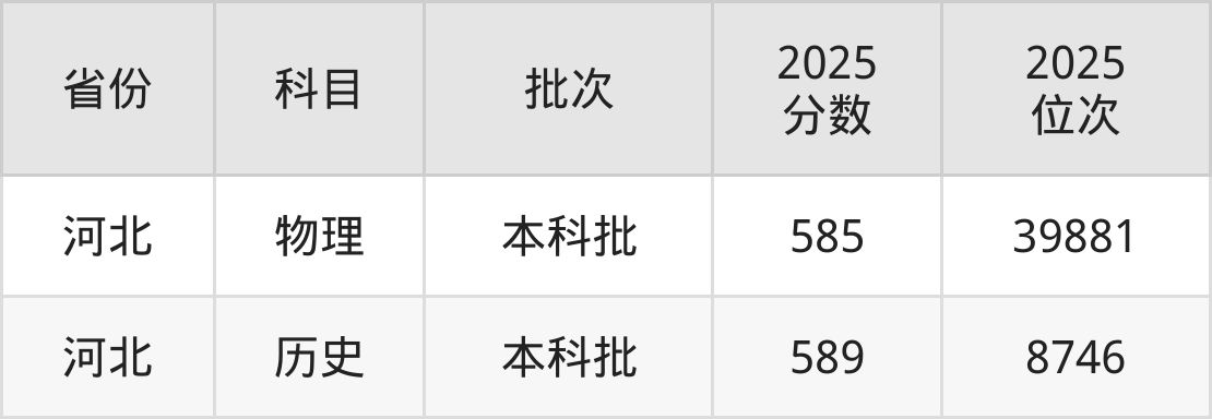 最低录取分数线是585分,对应位次是39881名,招生地区为河北。