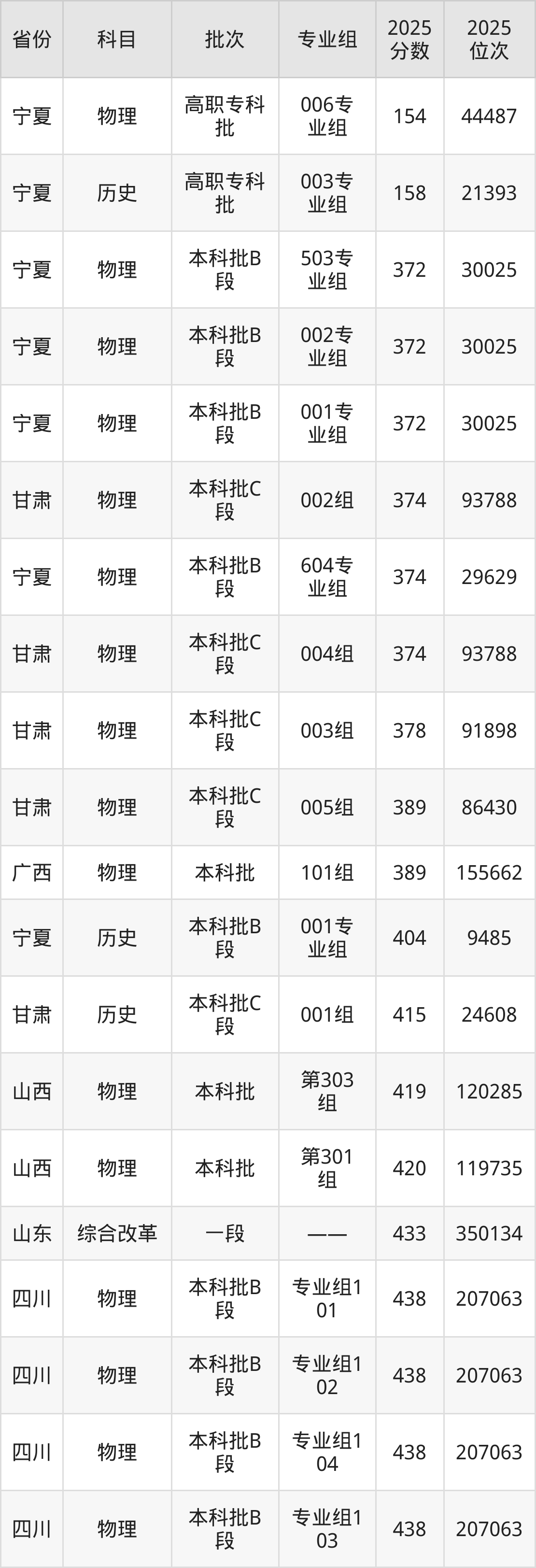 2025年银川能源学院在各省3+3综合改革的录取分数线为433分。