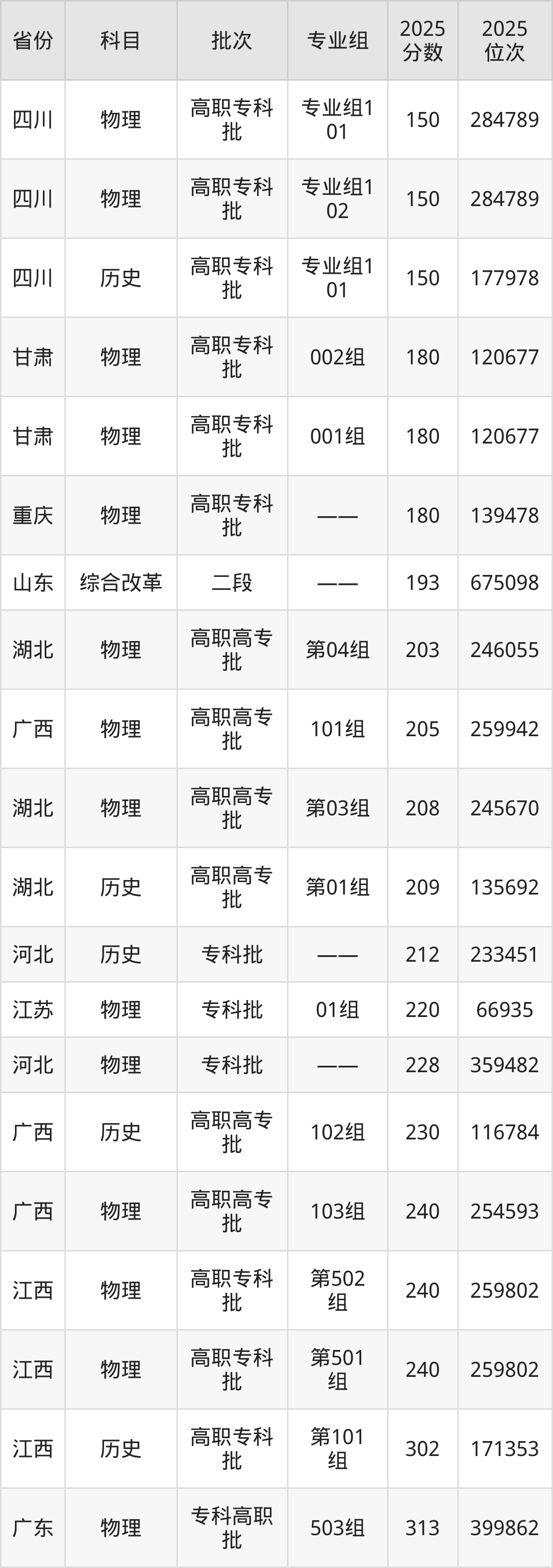 最低录取分数线是150分,对应位次是177978名,招生地区为四川;