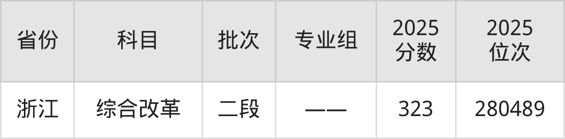 最高录取分数线是323分,对应位次是280489名,招生地区为浙江。