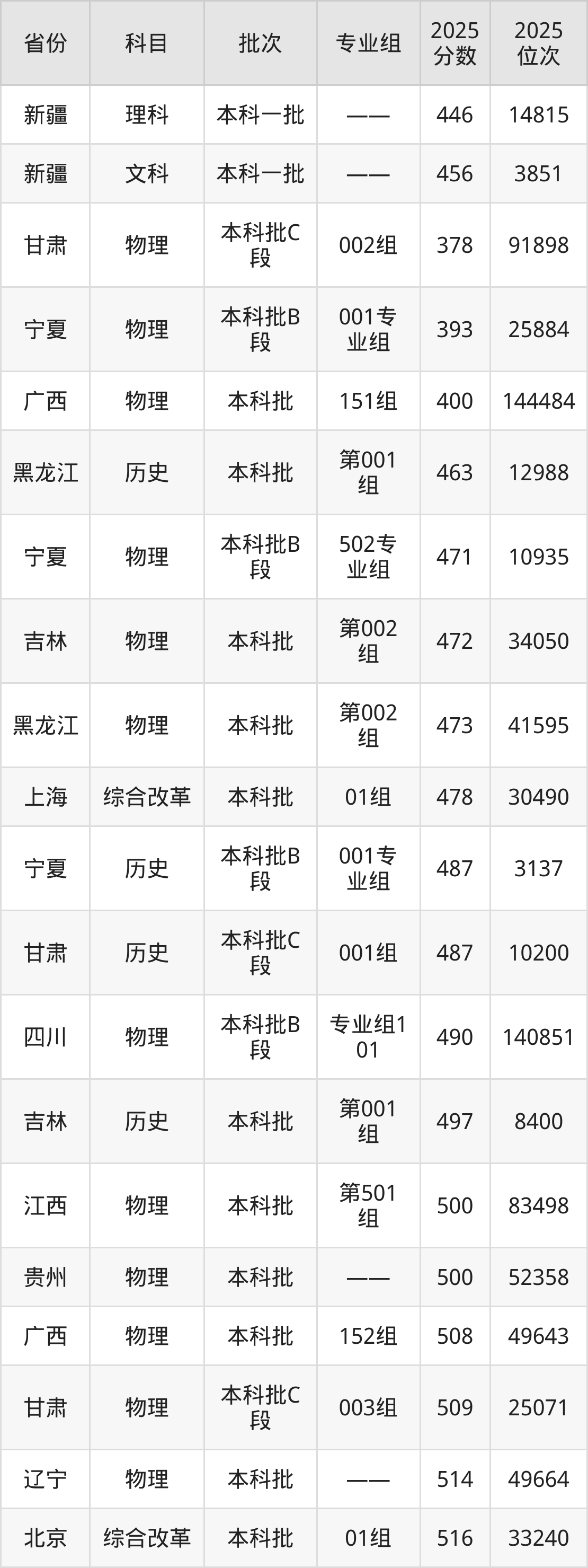 最低录取分数线是456分,对应位次是3851名,招生地区为新疆;