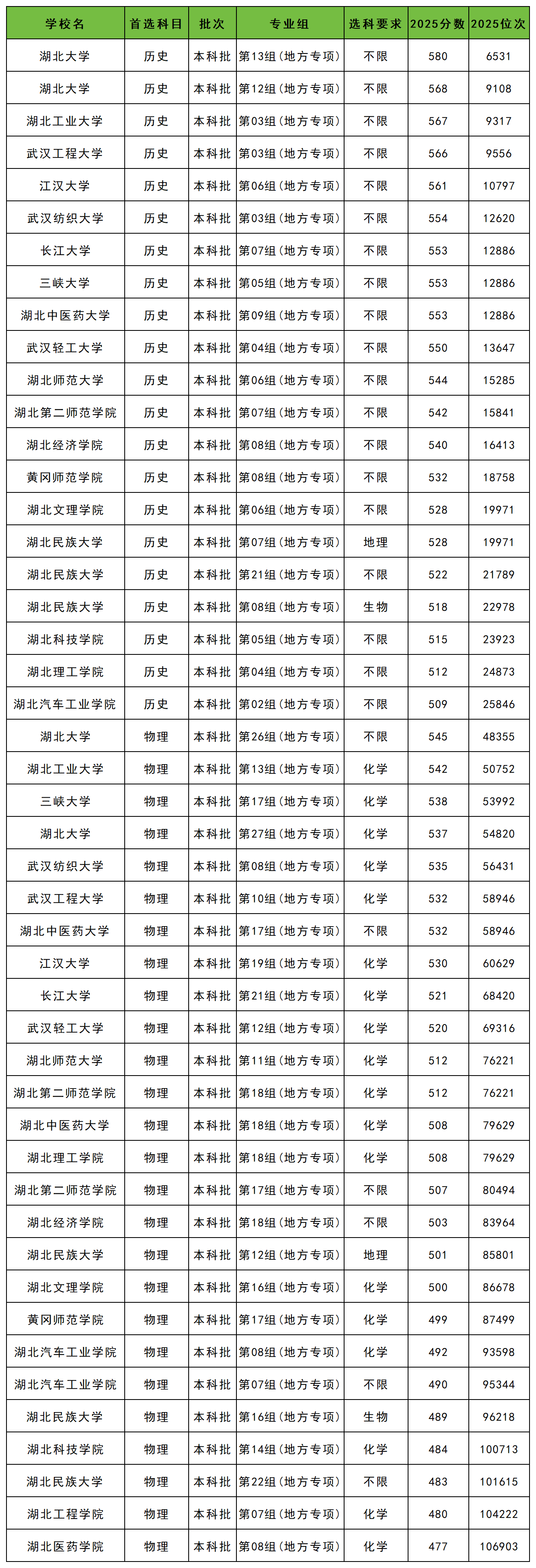 2025年湖北地方专项计划最低录取分数线:历史类509分、物理类477分。