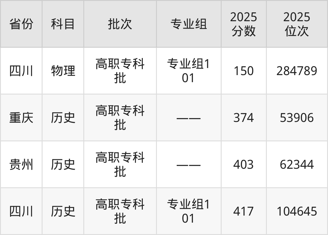 最低录取分数线是150分,对应位次是284789名,招生地区为四川。