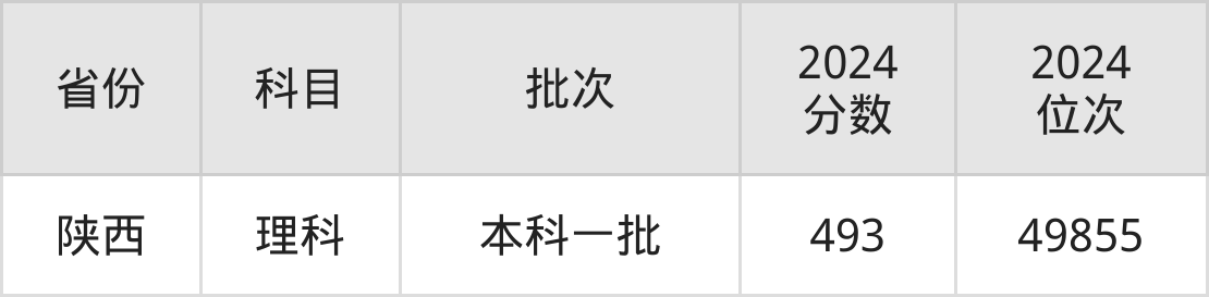 最低录取分数线是493分,对应位次是49855名,招生地区为陕西。