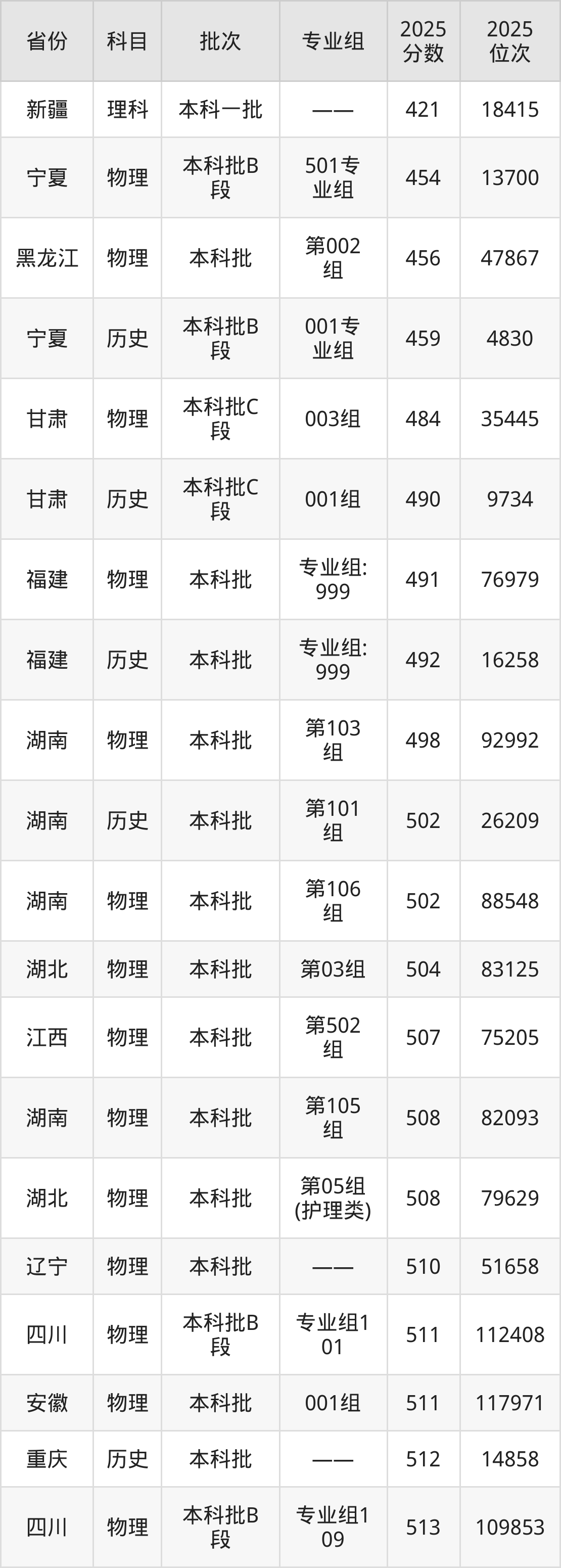 最低录取分数线是421分,对应位次是18415名,招生地区为新疆;