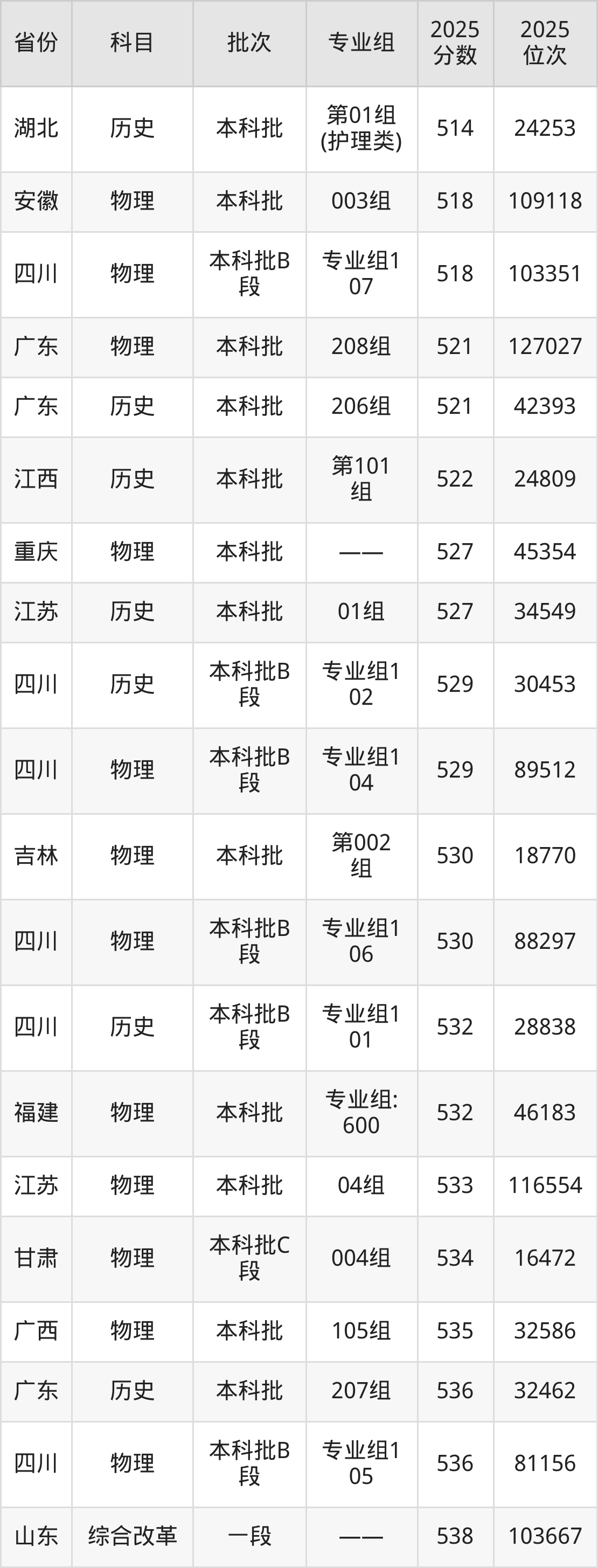 2025年川北医学院在各省历史类的录取分数线位于459分-536分之间。