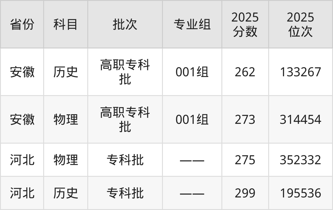 最低录取分数线是262分,对应位次是133267名,招生地区为安徽;