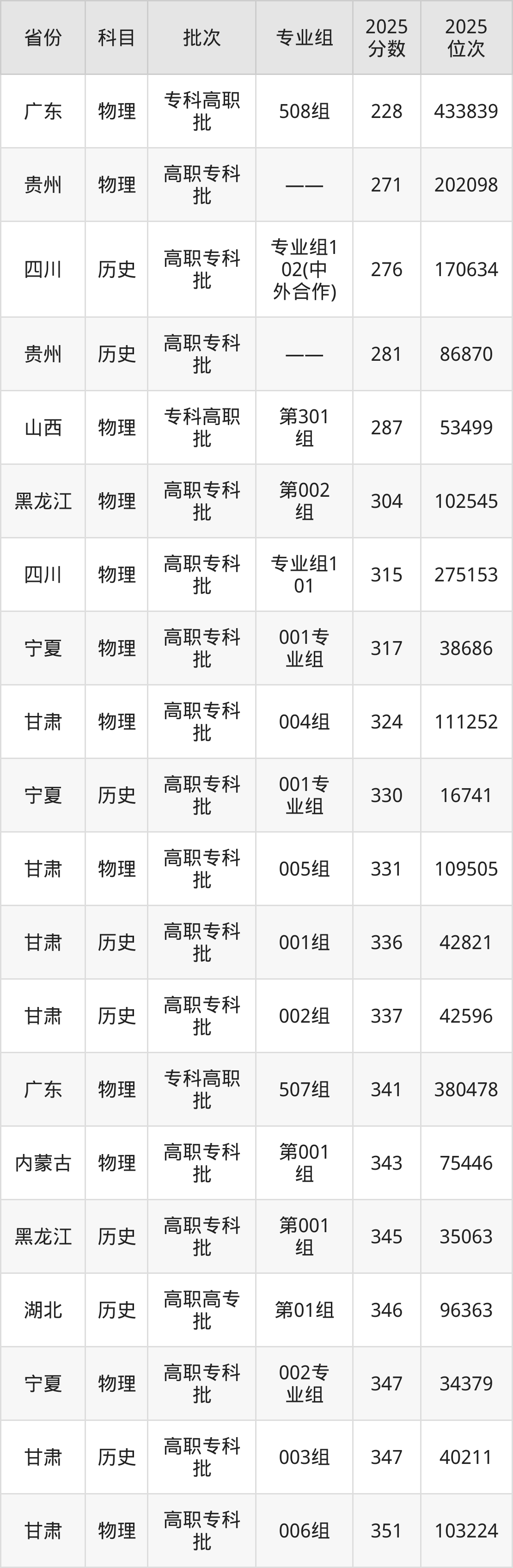2025年铜仁职业技术大学在各省普通批录取分数线一览表: