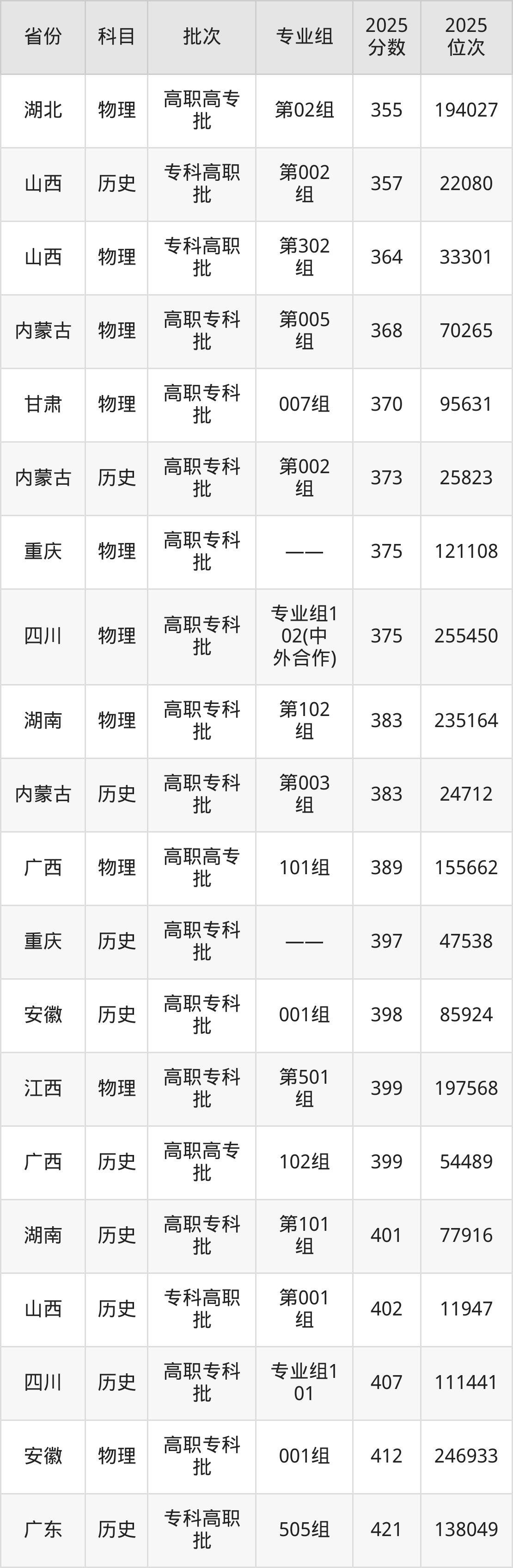 2025年铜仁职业技术大学在各省3+3综合改革的录取分数线为422分。