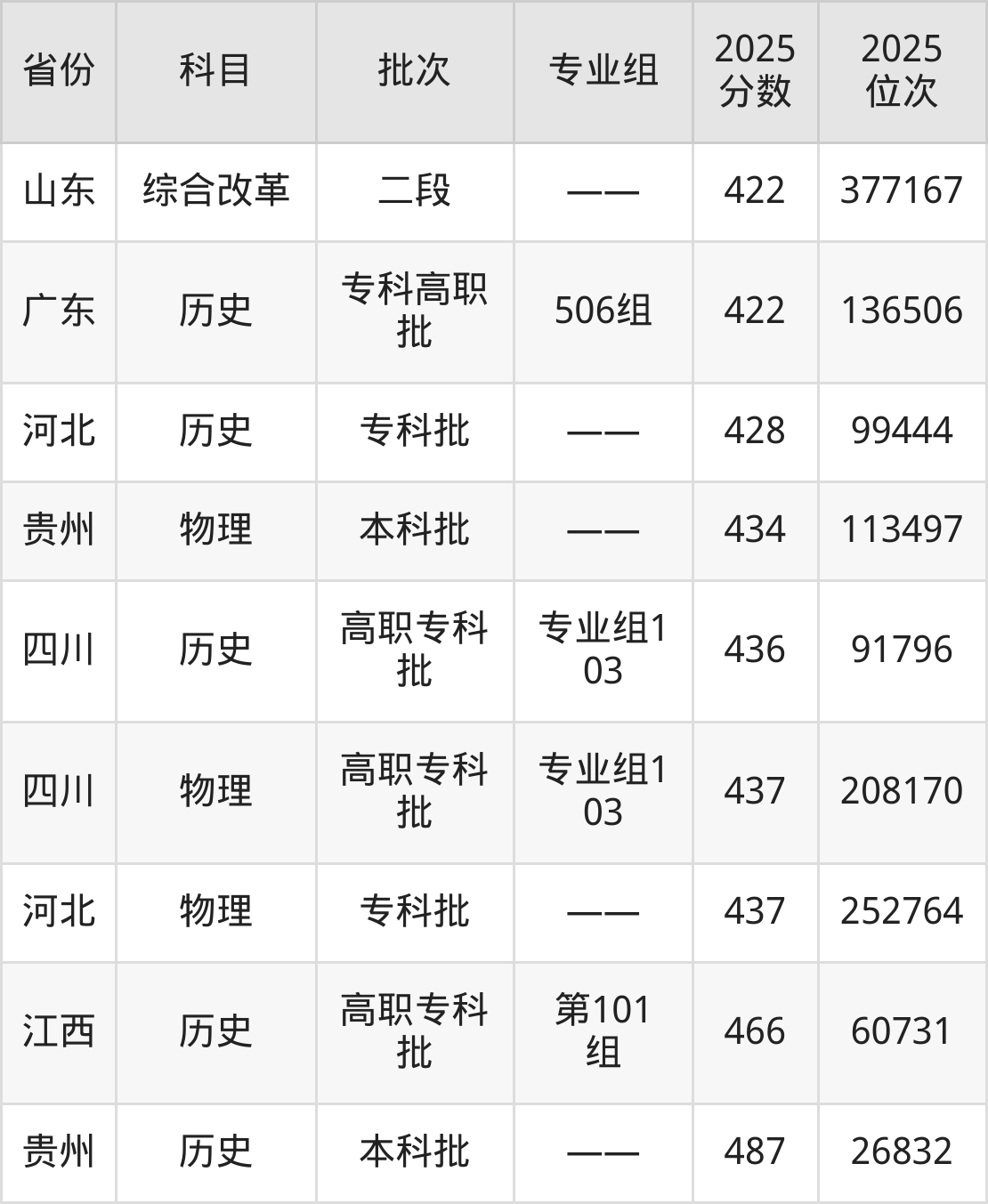 最低录取分数线是422分,对应位次是377167名,招生地区为山东。