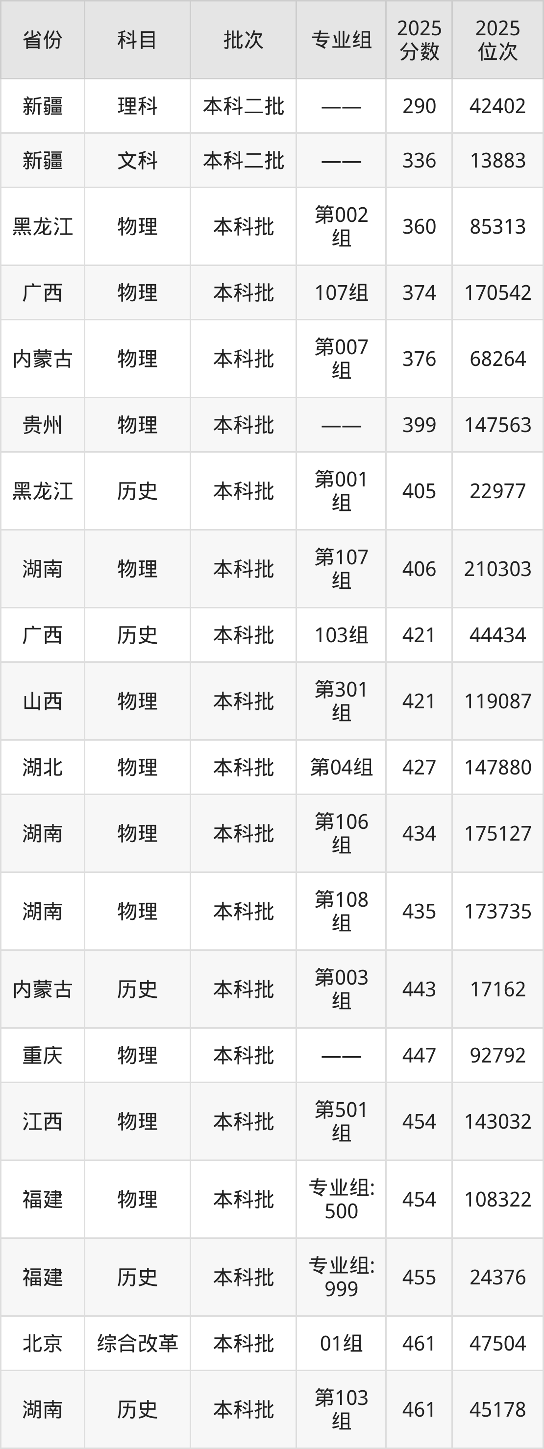 最低录取分数线是290分,对应位次是42402名,招生地区为新疆;