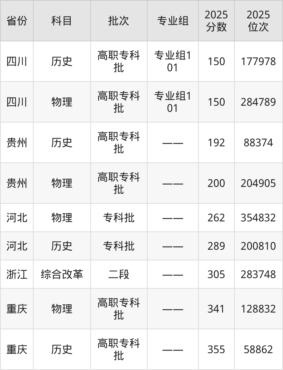 2025年贵州工程职业学院在各省物理类的录取分数线位于150分-341分之间。