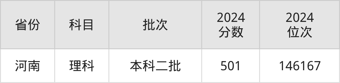 最低录取分数线是501分,对应位次是146167名,招生地区为河南。