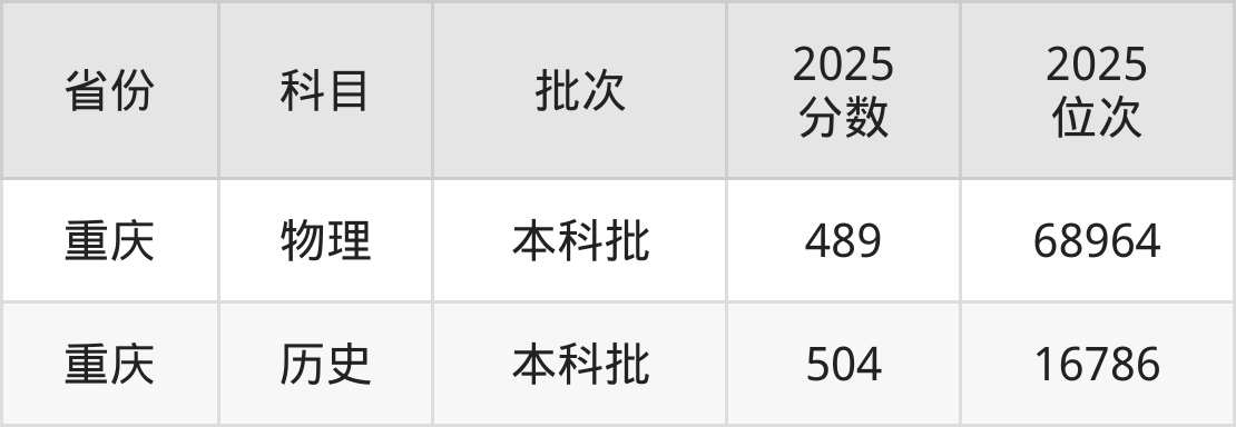 最低录取分数线是489分,对应位次是68964名,招生地区为重庆。
