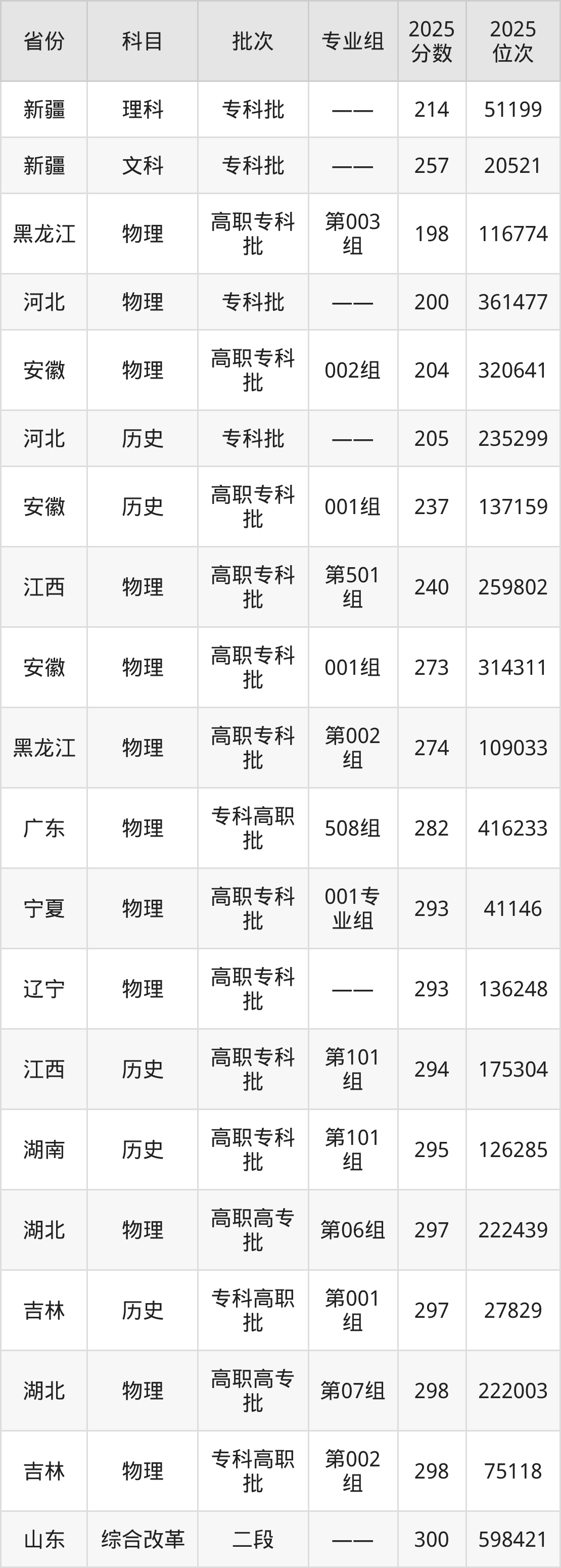 最低录取分数线是300分,对应位次是598421名,招生地区为山东;
