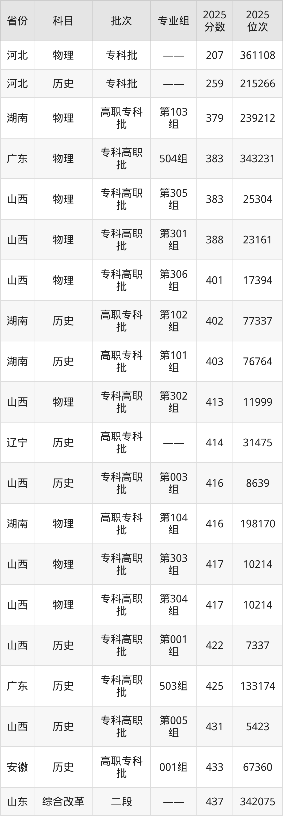 2025年石家庄职业技术学院在各省普通批录取分数线一览表:
