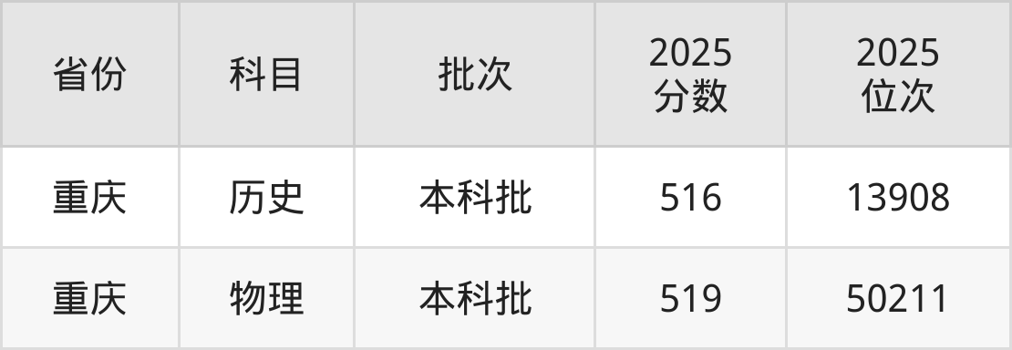 最低录取分数线是519分,对应位次是50211名,招生地区为重庆。