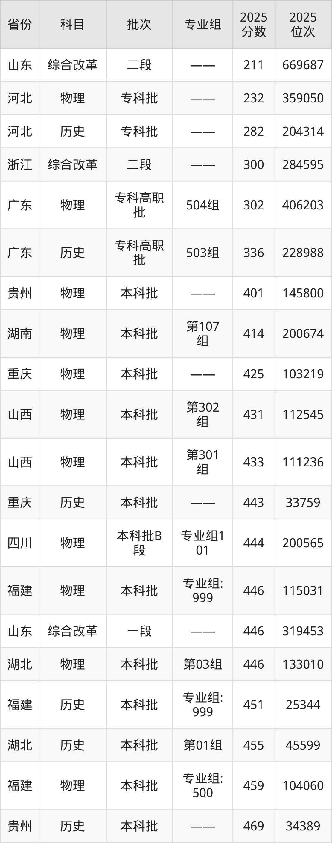 最低录取分数线是211分,对应位次是669687名,招生地区为山东;
