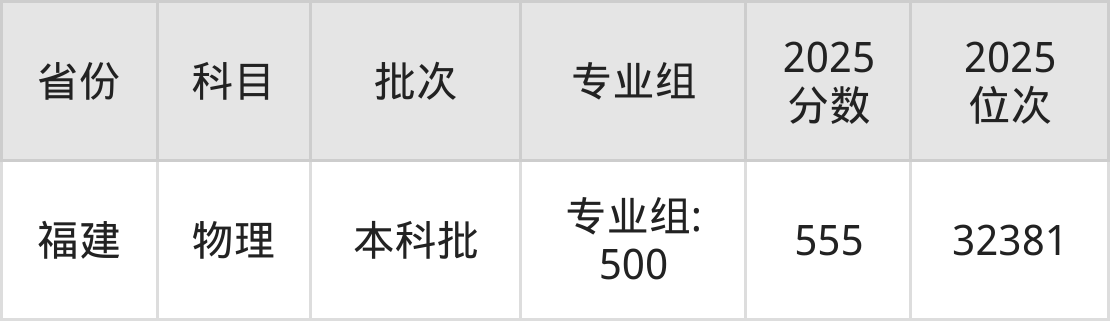 最低录取分数线是555分,对应位次是32381名,招生地区为福建。