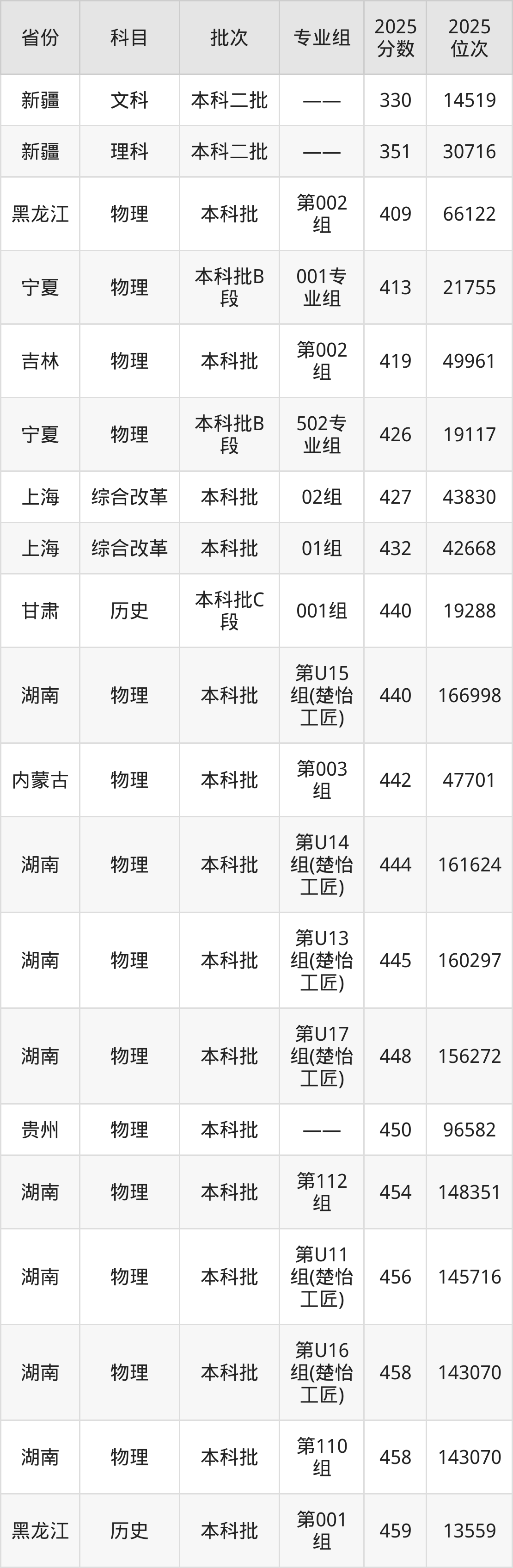 2025年湖南城市学院在普通批次招生,录取分数线是330分-561分。