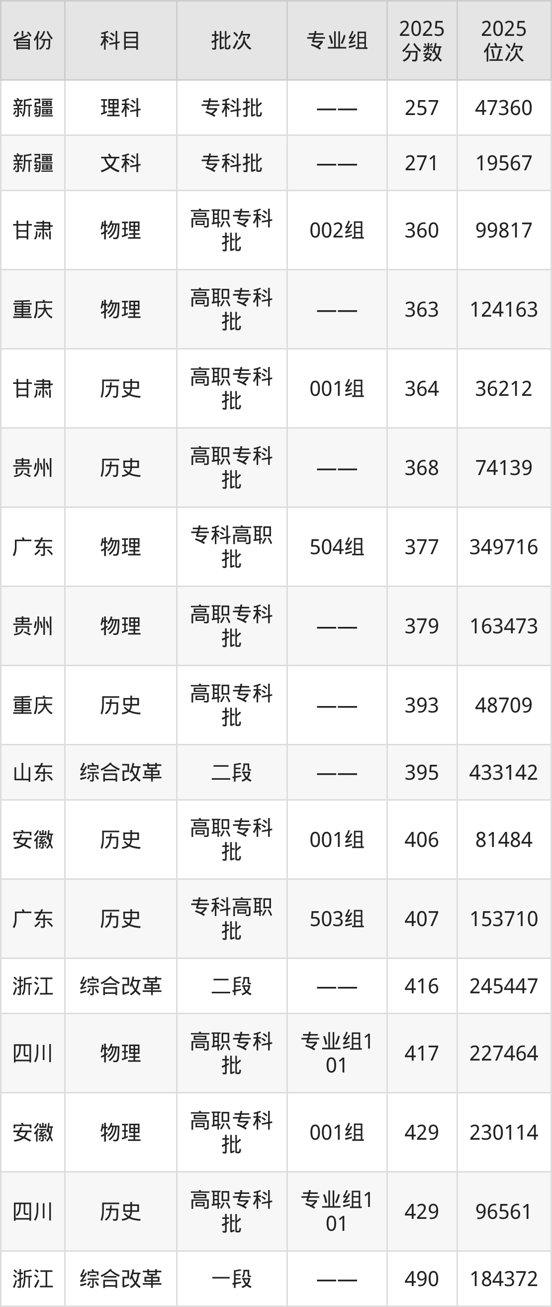 2025年四川化工职业技术学院在各省普通批录取分数线一览表: