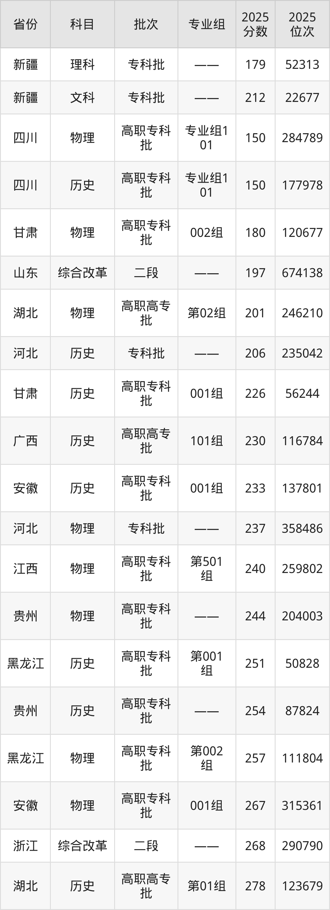 最低录取分数线是150分,对应位次是177978名,招生地区为四川;