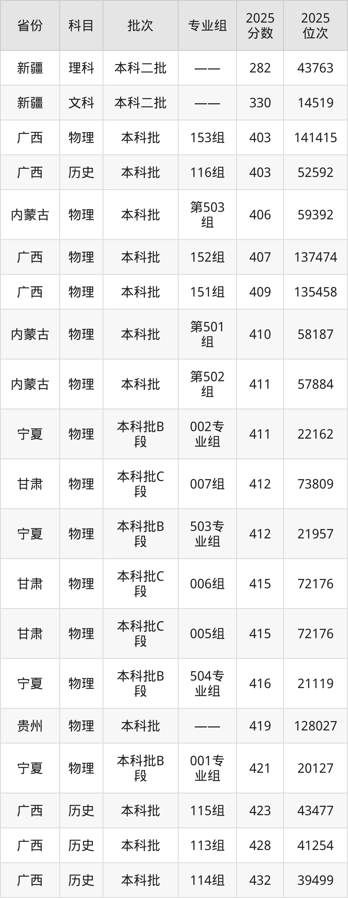 最低录取分数线是282分,对应位次是43763名,招生地区为新疆;