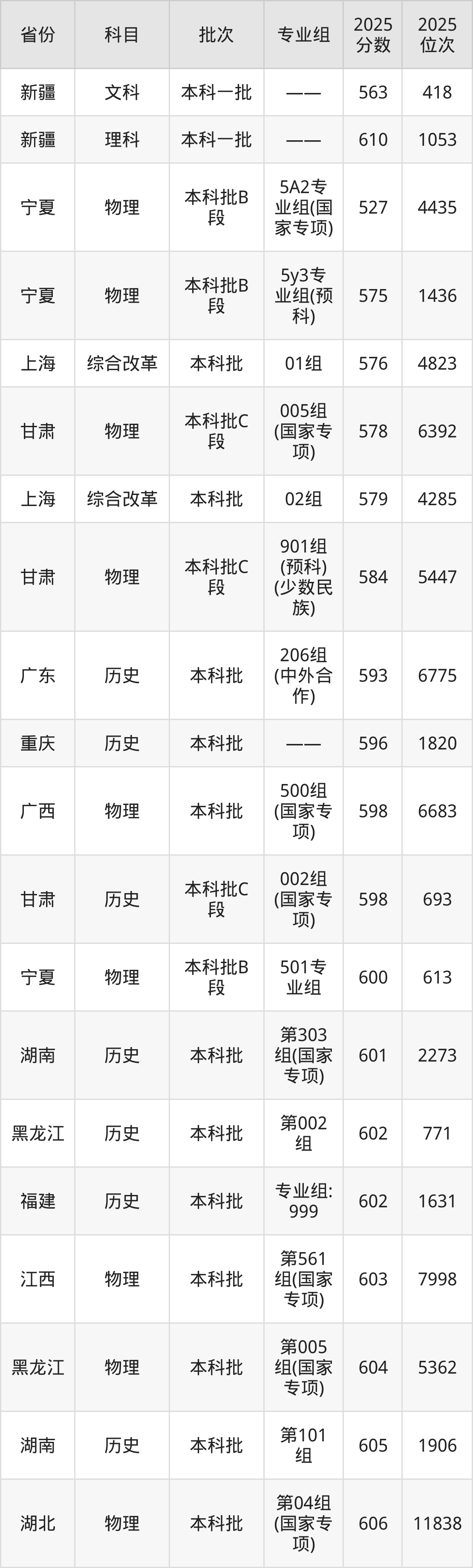 最低录取分数线是563分,对应位次是418名,招生地区为新疆;