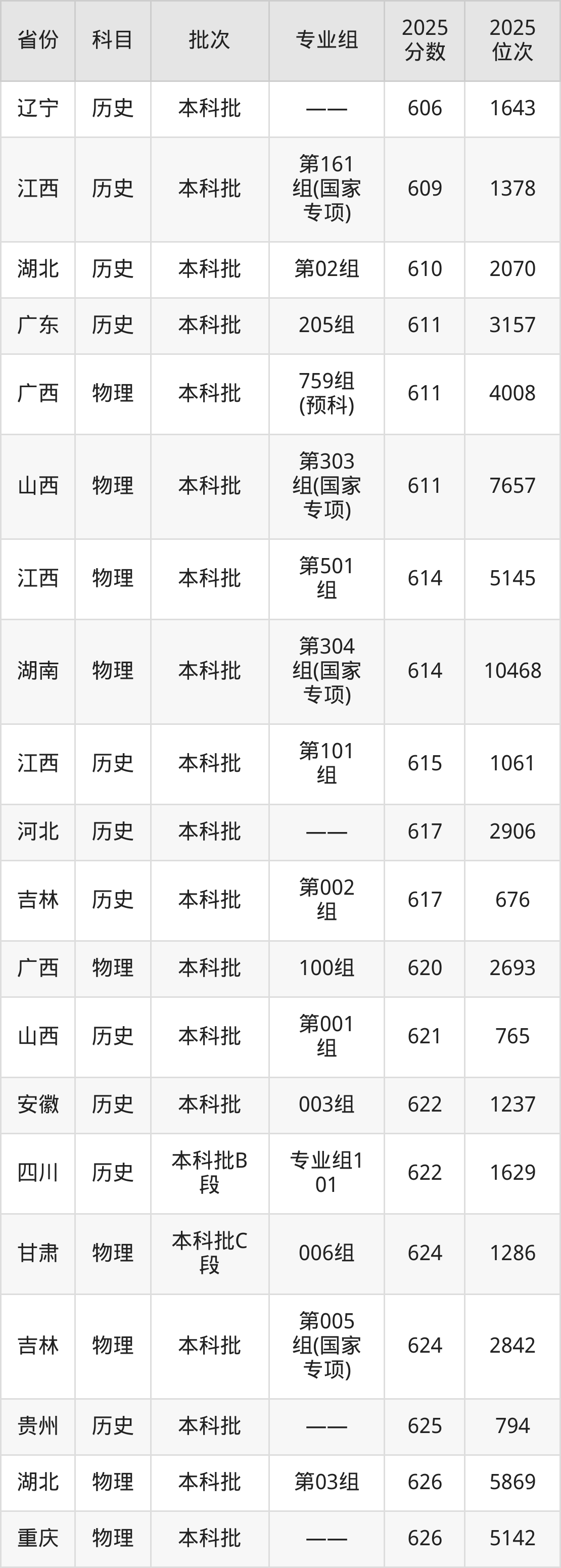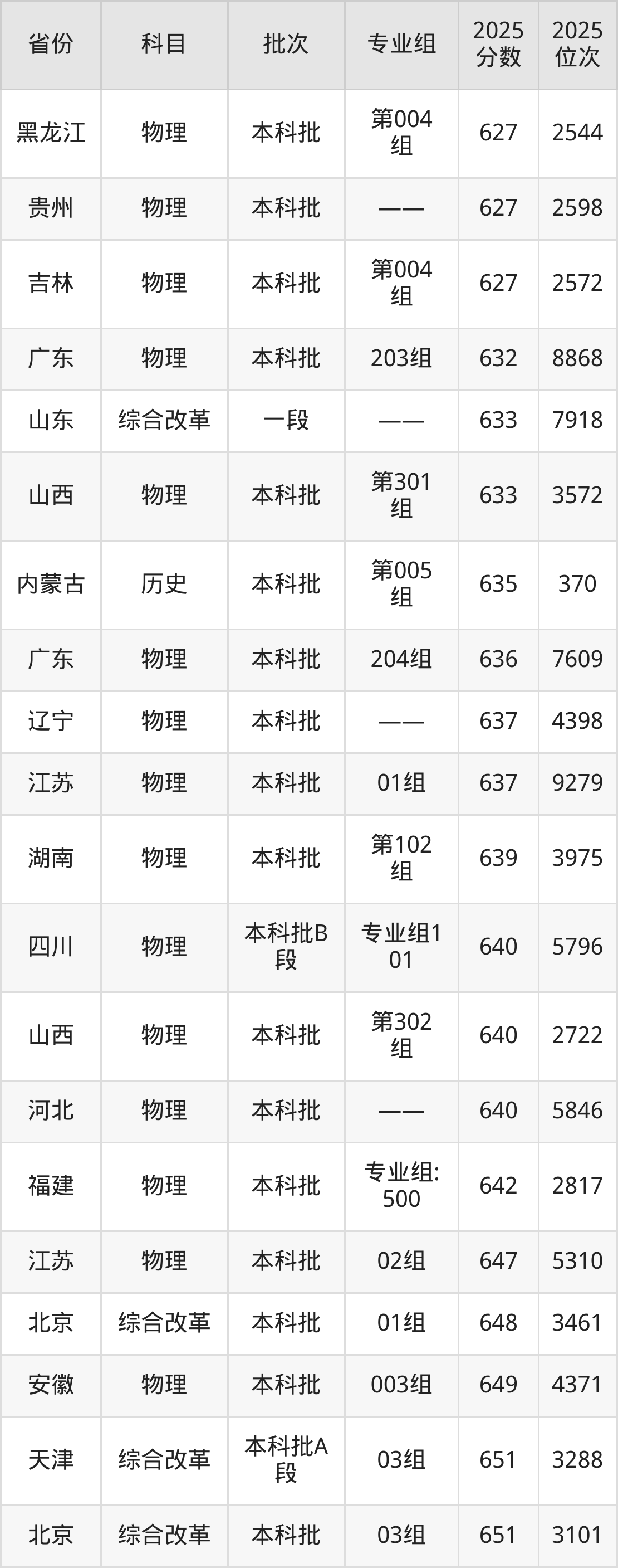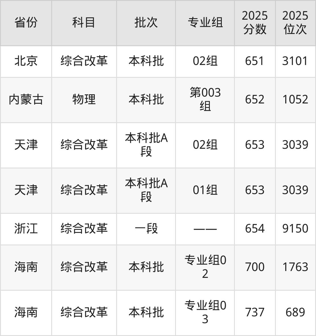 2025年天津大学在各省普通批录取分数线一览表: