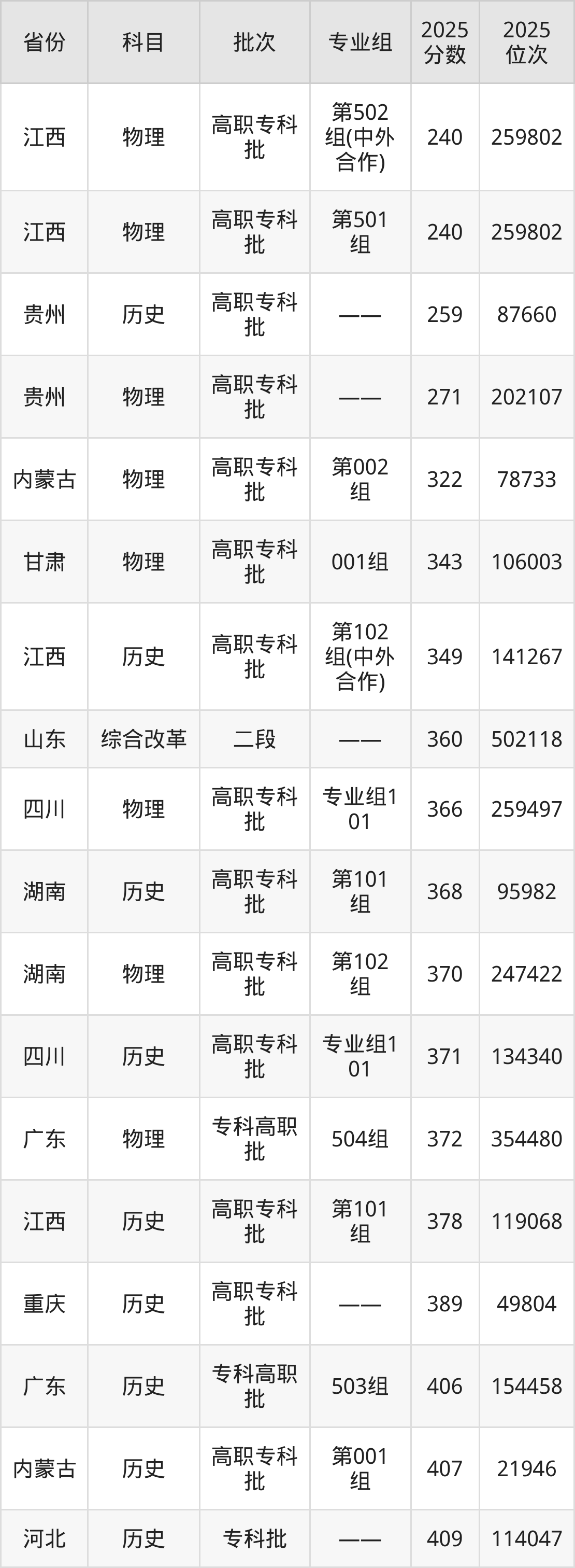 2025年抚州职业技术学院在各省普通批录取分数线一览表: