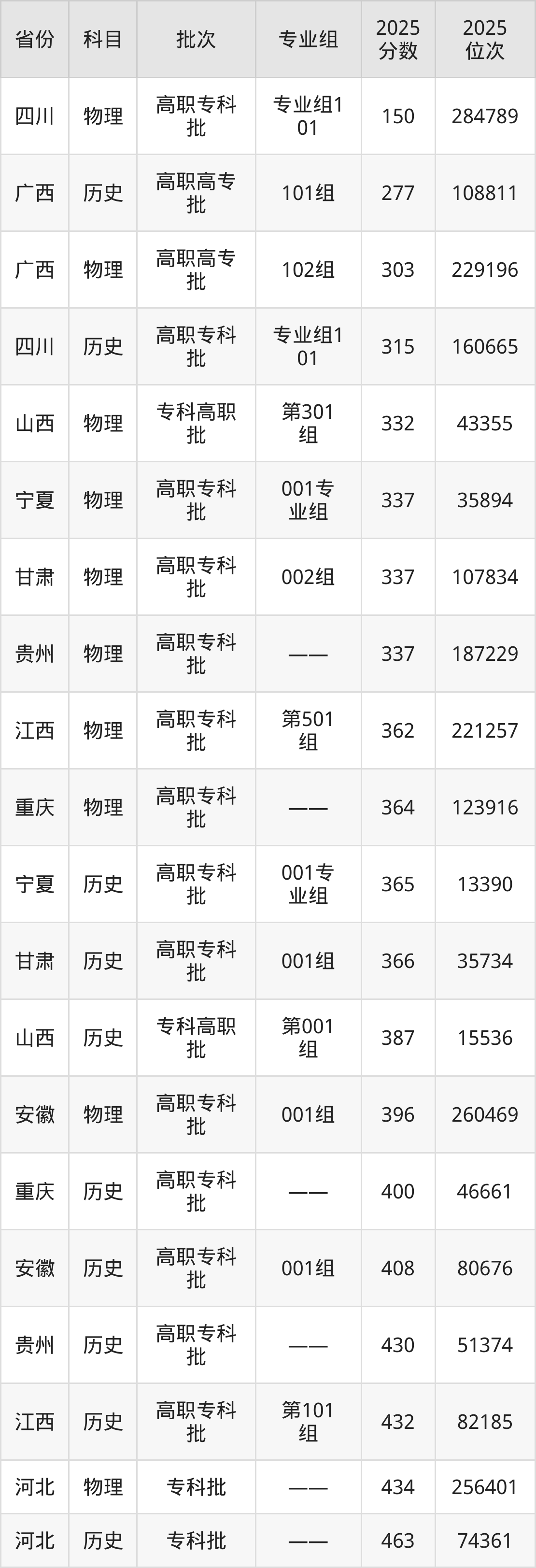 最低录取分数线是150分,对应位次是284789名,招生地区为四川;