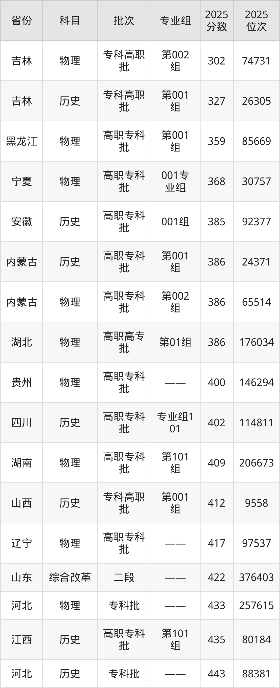2025年吉林水利电力职业学院在各省普通批录取分数线一览表: