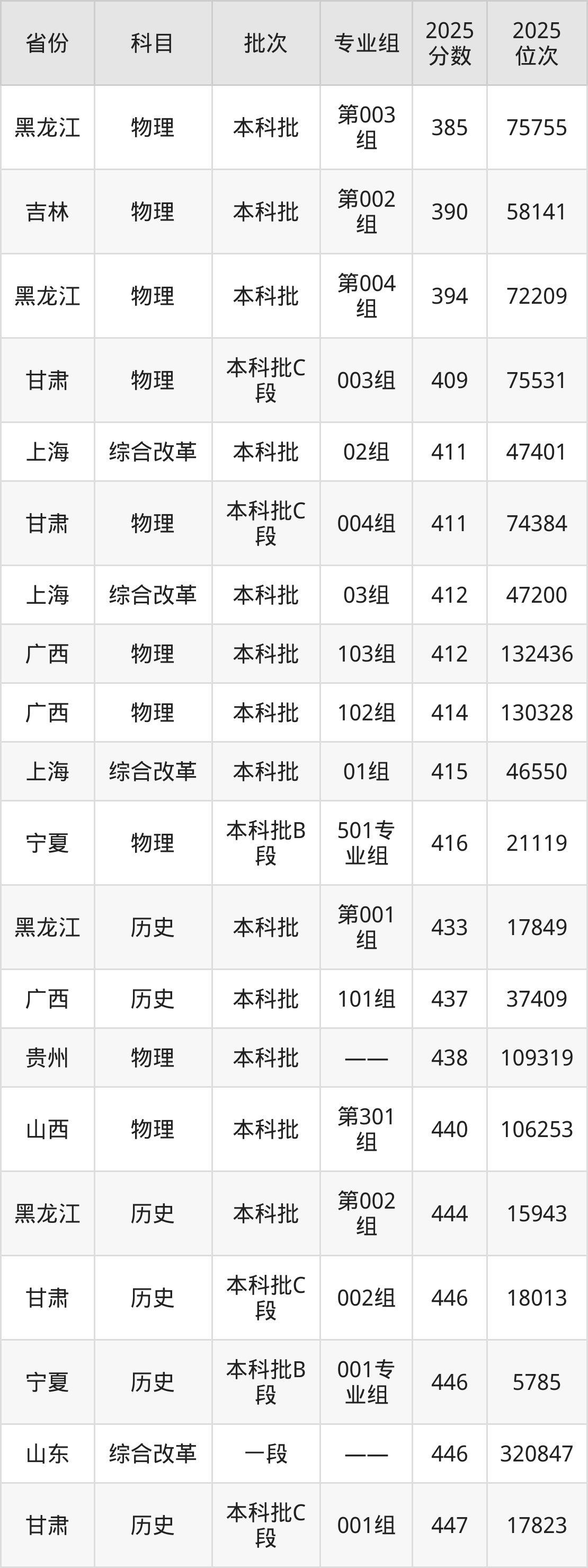 最低录取分数线是385分,对应位次是75755名,招生地区为黑龙江;